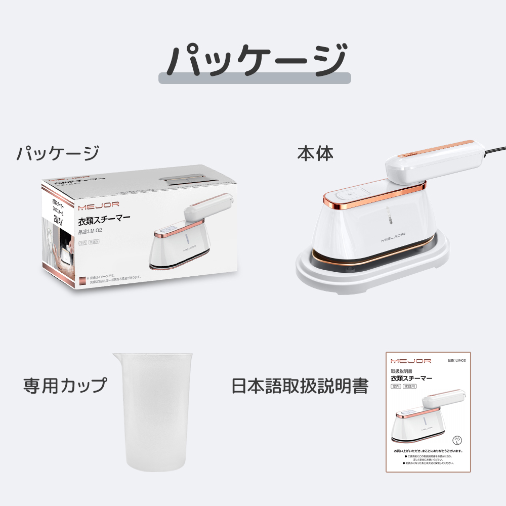 スチームアイロン本体(コード付き)、計量カップ、、日本語取扱説明書(保証書付き)