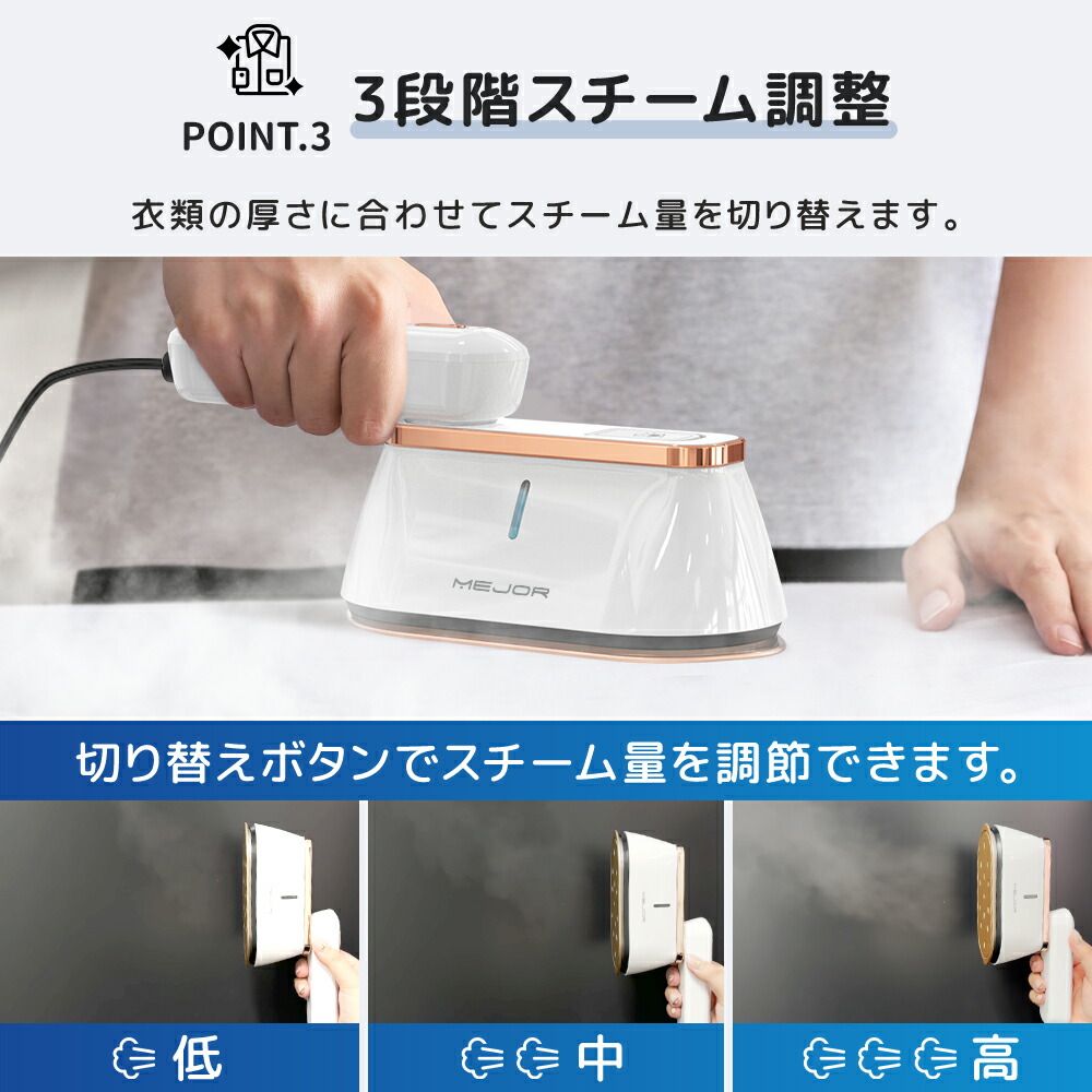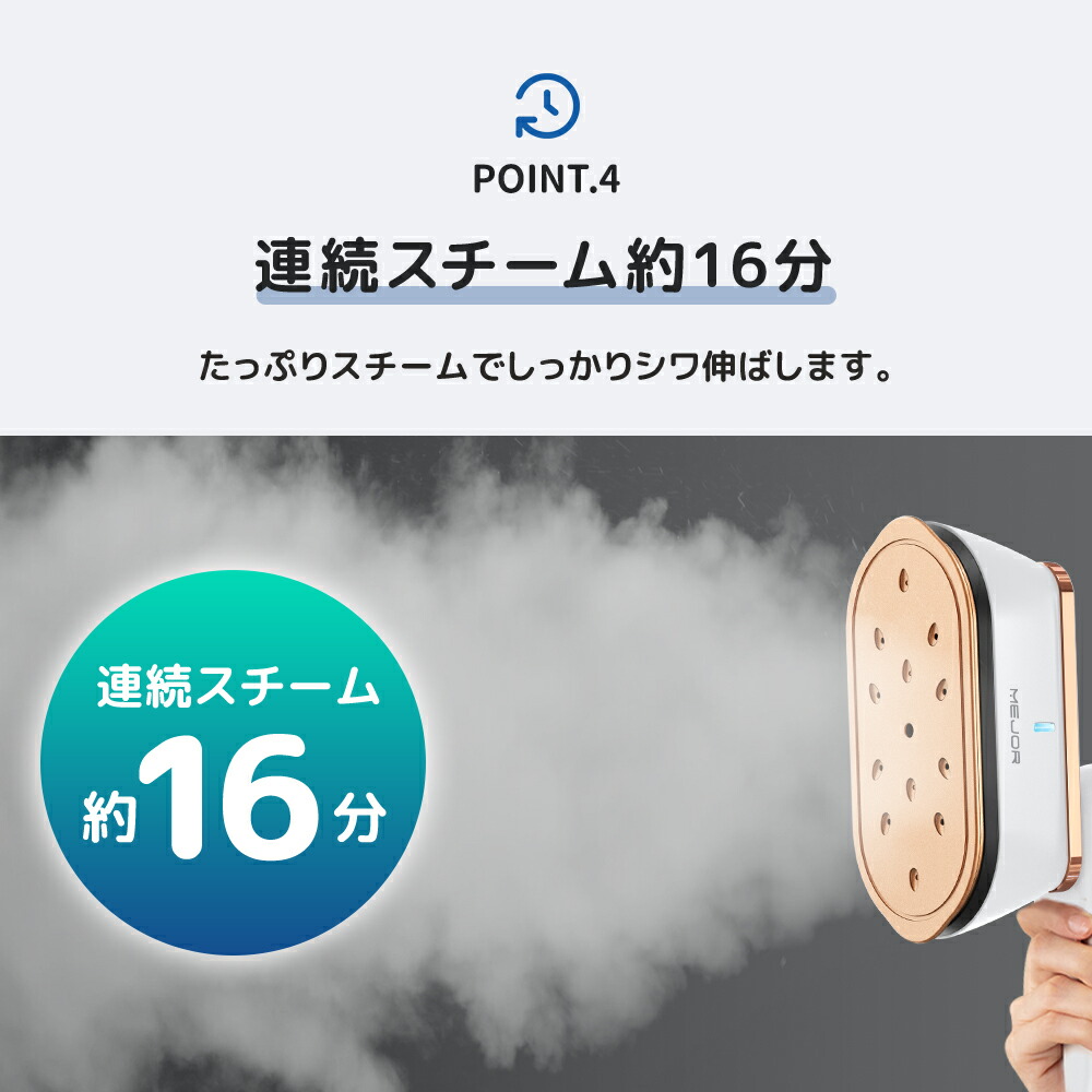 立ち上がりが早く、電源に繋いで、約15秒予熱した後、すぐに使える スチームアイロン です。1000Wのハイパワーで、強力な スチーム が吹き出し、衣類繊維の奥まで浸透させ、キレイにシワ伸ばしながら型崩れを直してくれます。忙しい朝も、さっと仕上がります。120mlたっぷり大容量水タンクにより、一回の注水で約15分間連続使用可能、何枚もかけ続けられ、制服一式手軽に対応できます。お出かけの前に素早く身だしなみを整えることができ、ビジネスマン、家庭主婦、一人暮らしの学生や社会人に大活躍な ハンディスチーマー です。