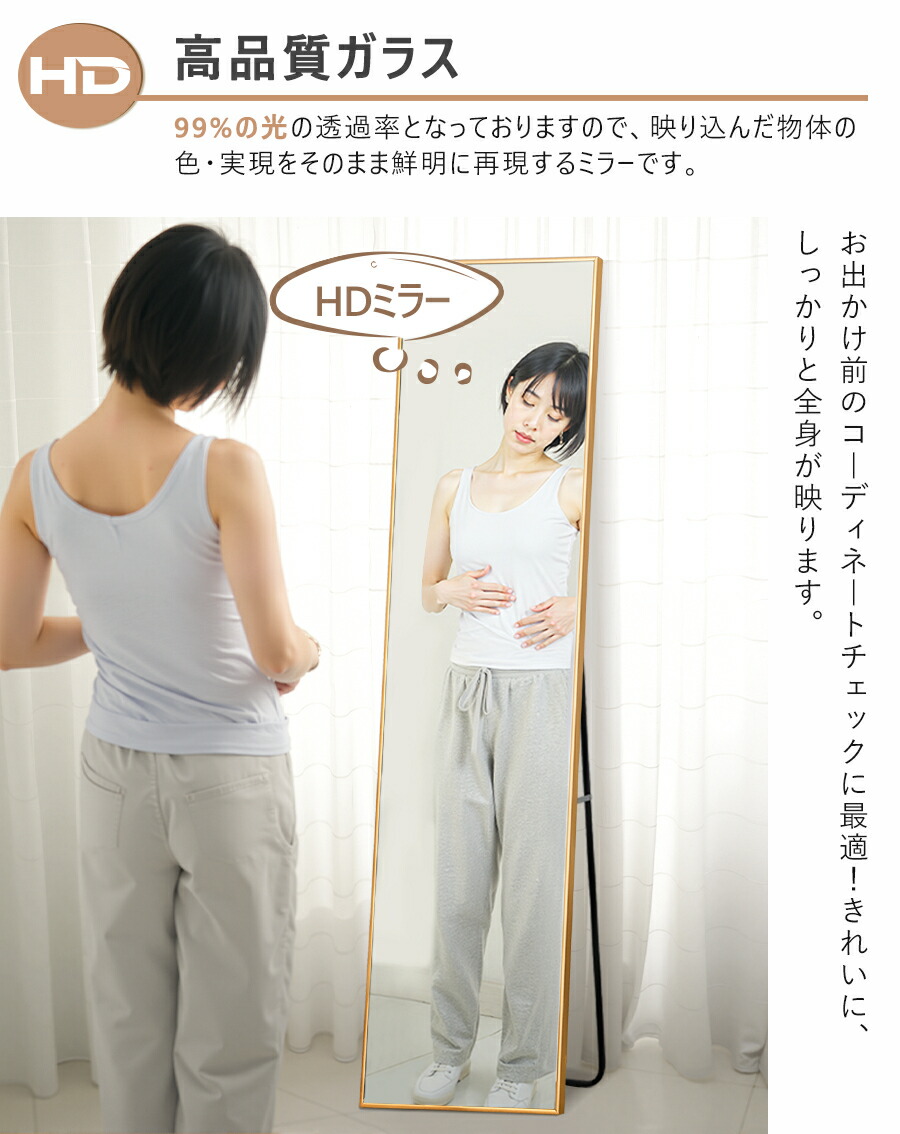 高品質なガラス素材を使用する全身鏡、顔や全身の映像をクリアに映し出します。毎日のコーディネートチェックや身だしなみ確認に最適です。