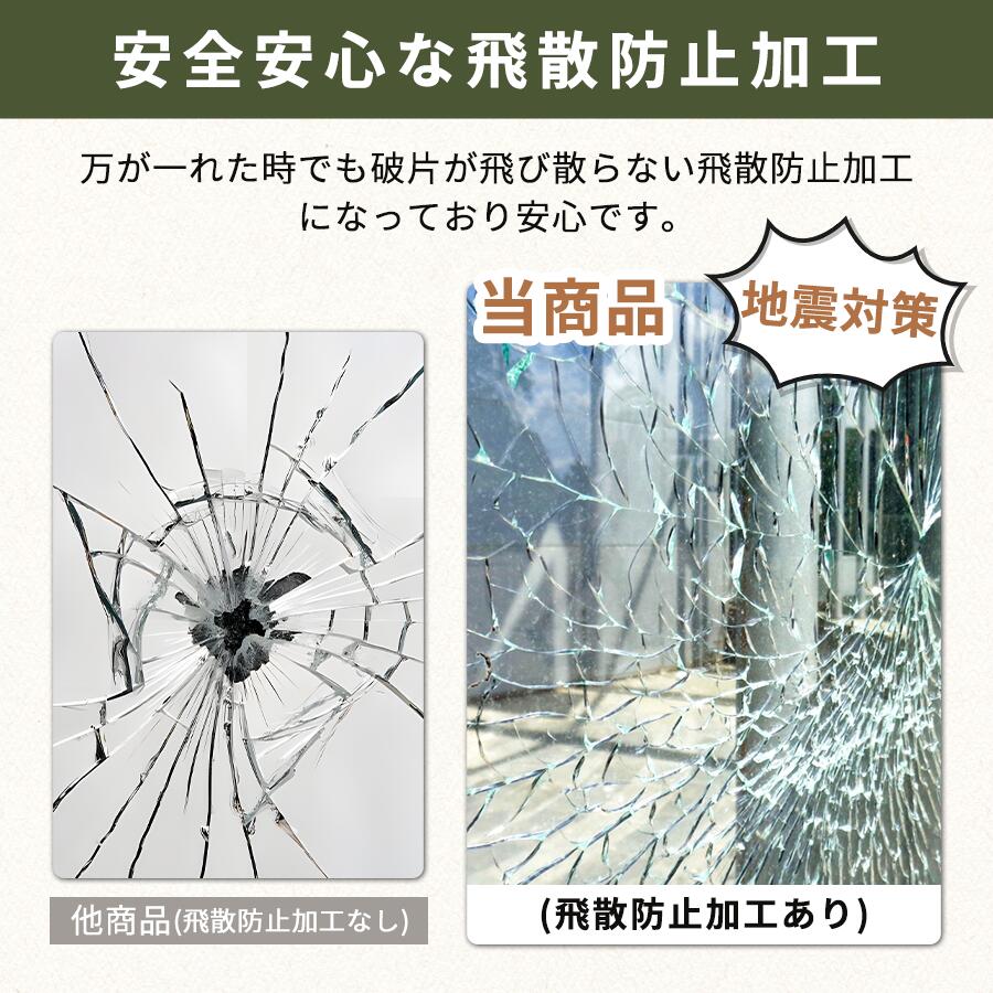 万が一、鏡が割れても飛散防止加工が施されているため、破片が飛び散らず安全です。お子様のいる家庭や公共の場でも安心してお使いいただけます。