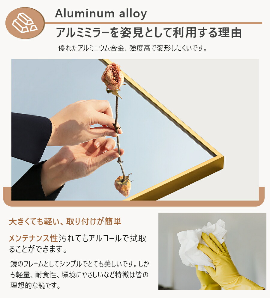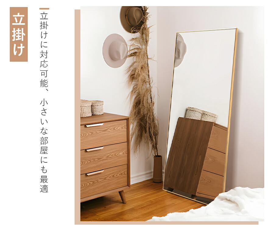 しっかりとしたアルミフレームを採用し、北欧風やモダンなインテリアにもマッチの全身鏡です。長期間使用できる耐久性を備えています
