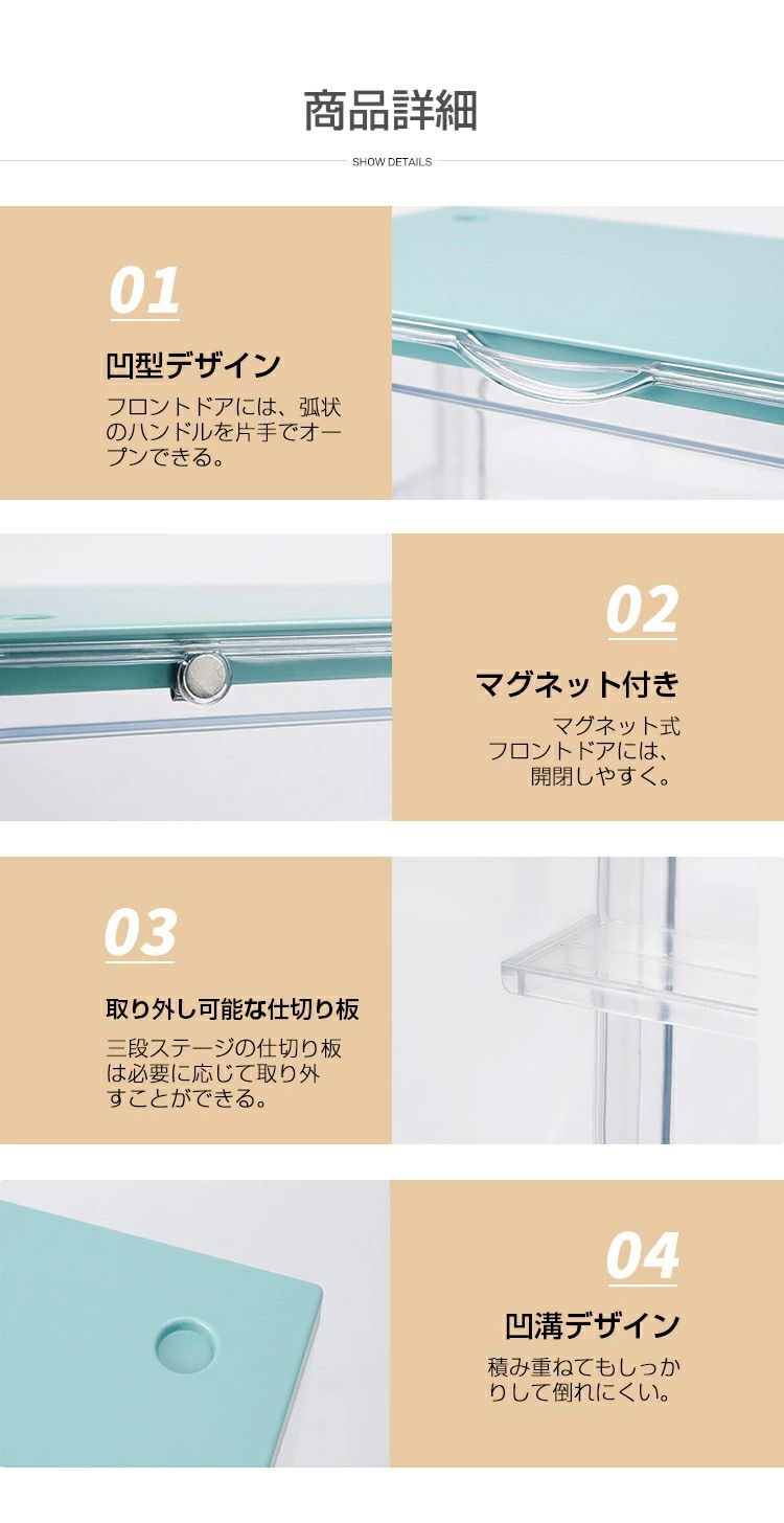 透明のディスプレイボックスは、上面および底面に凹凸があり、自由に重ね着でき、傾ける際に転倒しないように便利です。ディスプレイウォールとして積み重ね可能。