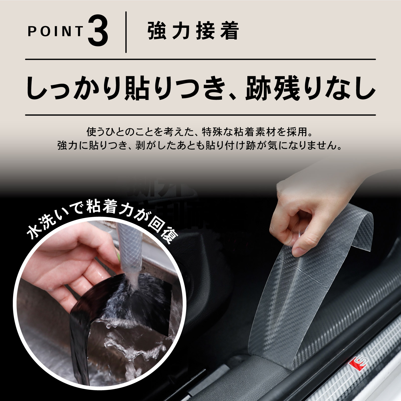 注意)取付面に油分・汚れ・水分が残っていると剥がれやすくなります。しっかりと拭き取り、指で取付面や接着部分に触れないようにして下さい。