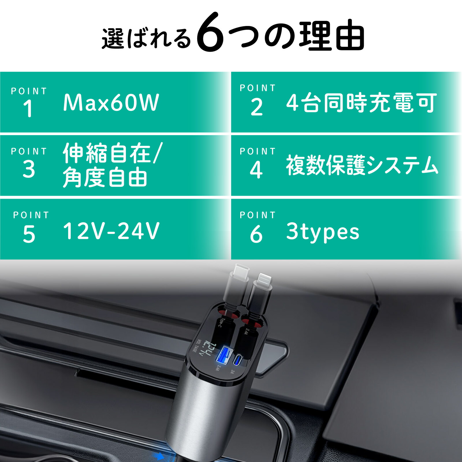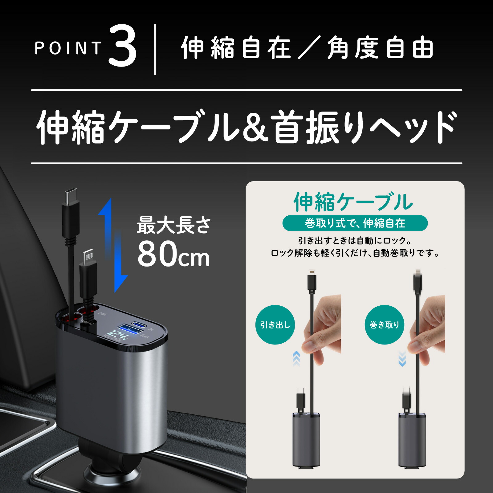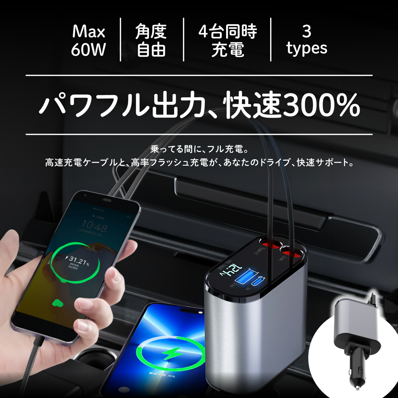 [選べる3タイプ] シガーソケット 充電器 4ポート 急速 快速 カーチャージャー シガーチャージャー 伸縮ケーブル USB 車用 カー用品 iPhone android 12V 24V Lightning type-C
