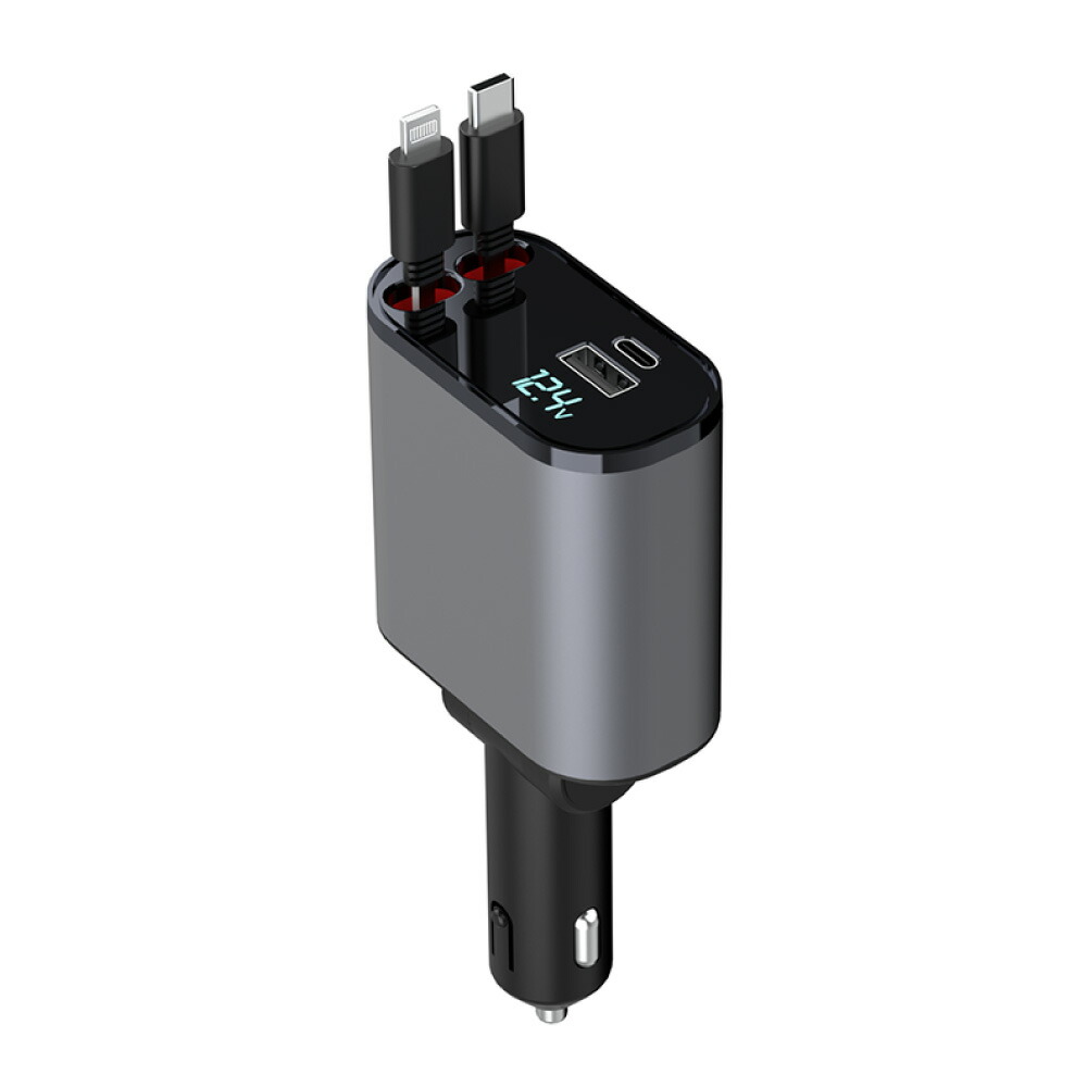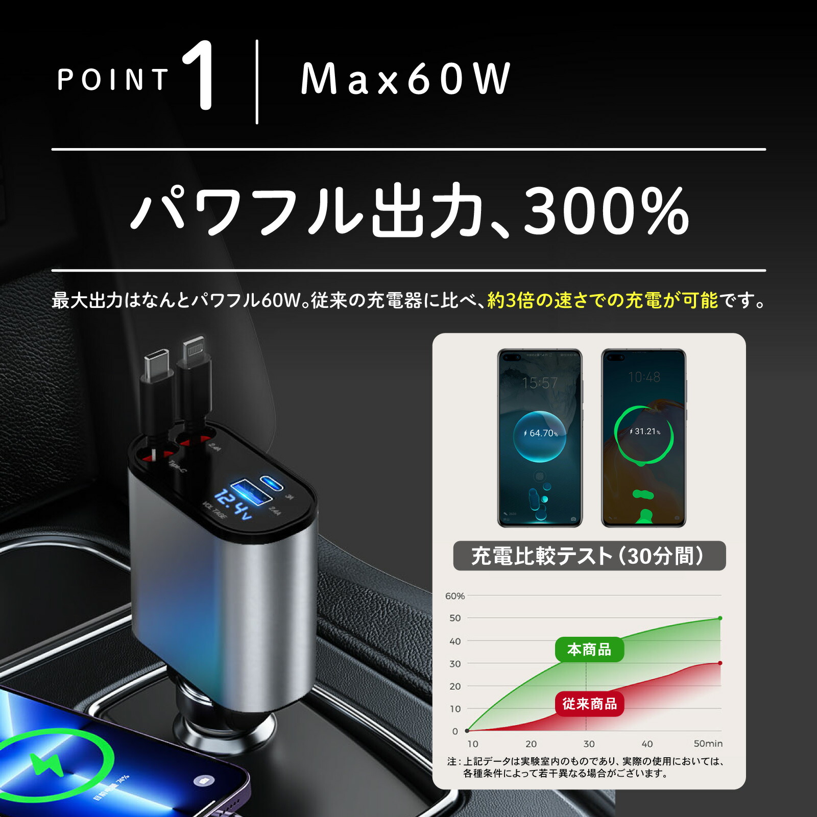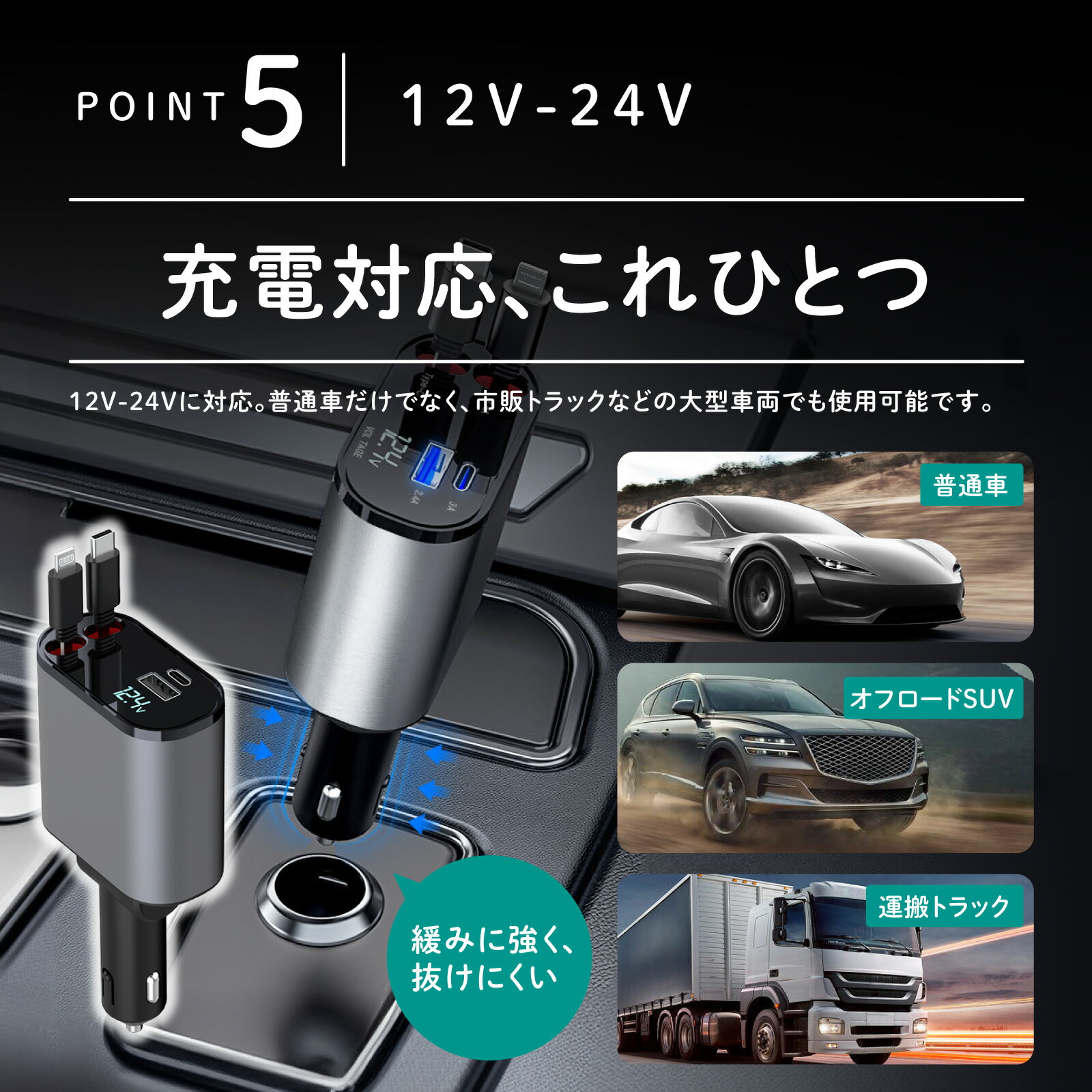 [選べる3タイプ] シガーソケット 充電器 4ポート 急速 快速 カーチャージャー シガーチャージャー 伸縮ケーブル USB 車用 カー用品 iPhone android 12V 24V Lightning type-C