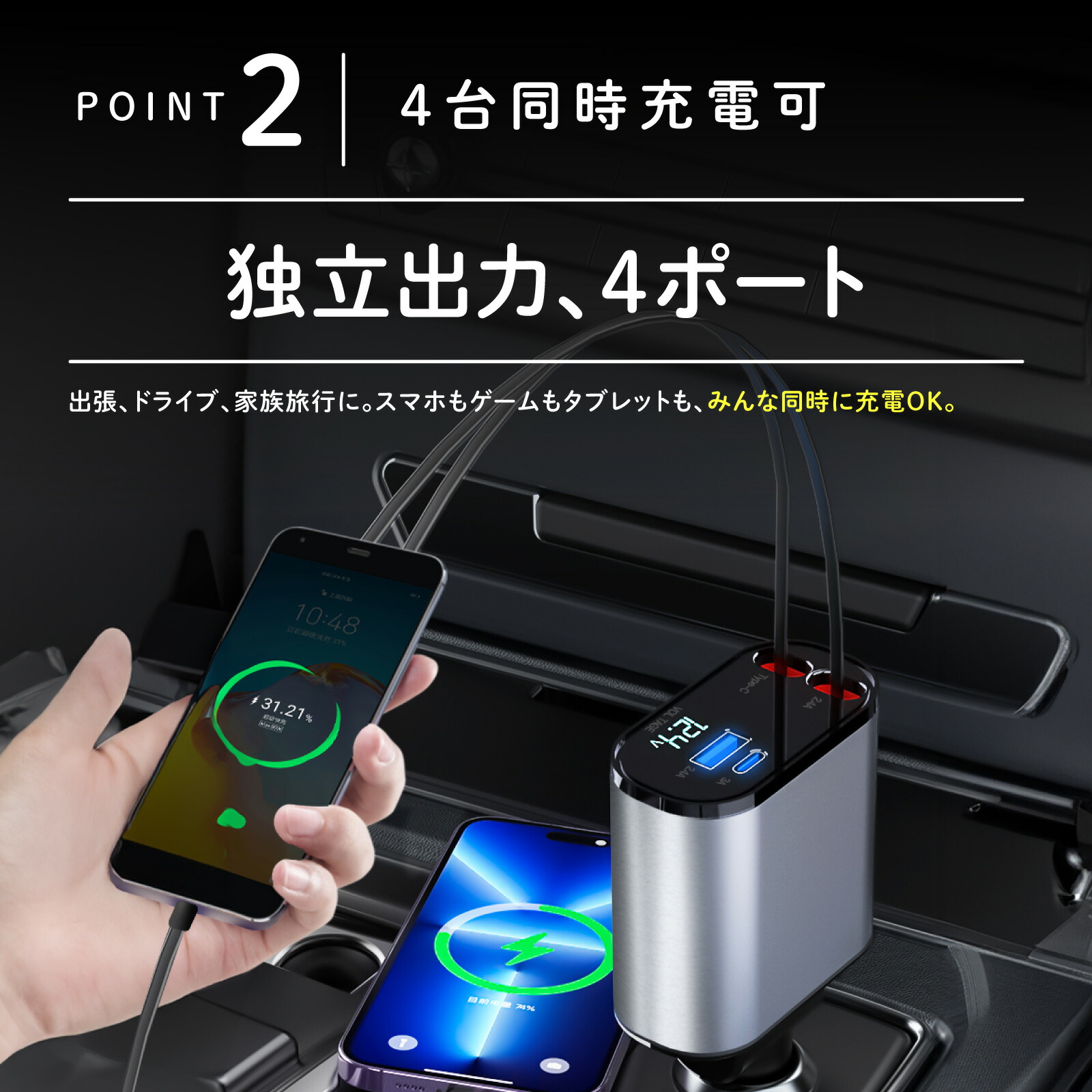 シガーソケット 充電器 4ポート 車 リール式 巻き取り 急速 快速 高速 カーチャージャー シガーチャージャー 伸縮ケーブル USB 車用 4台同時充電 android 12V 24 iPhone
