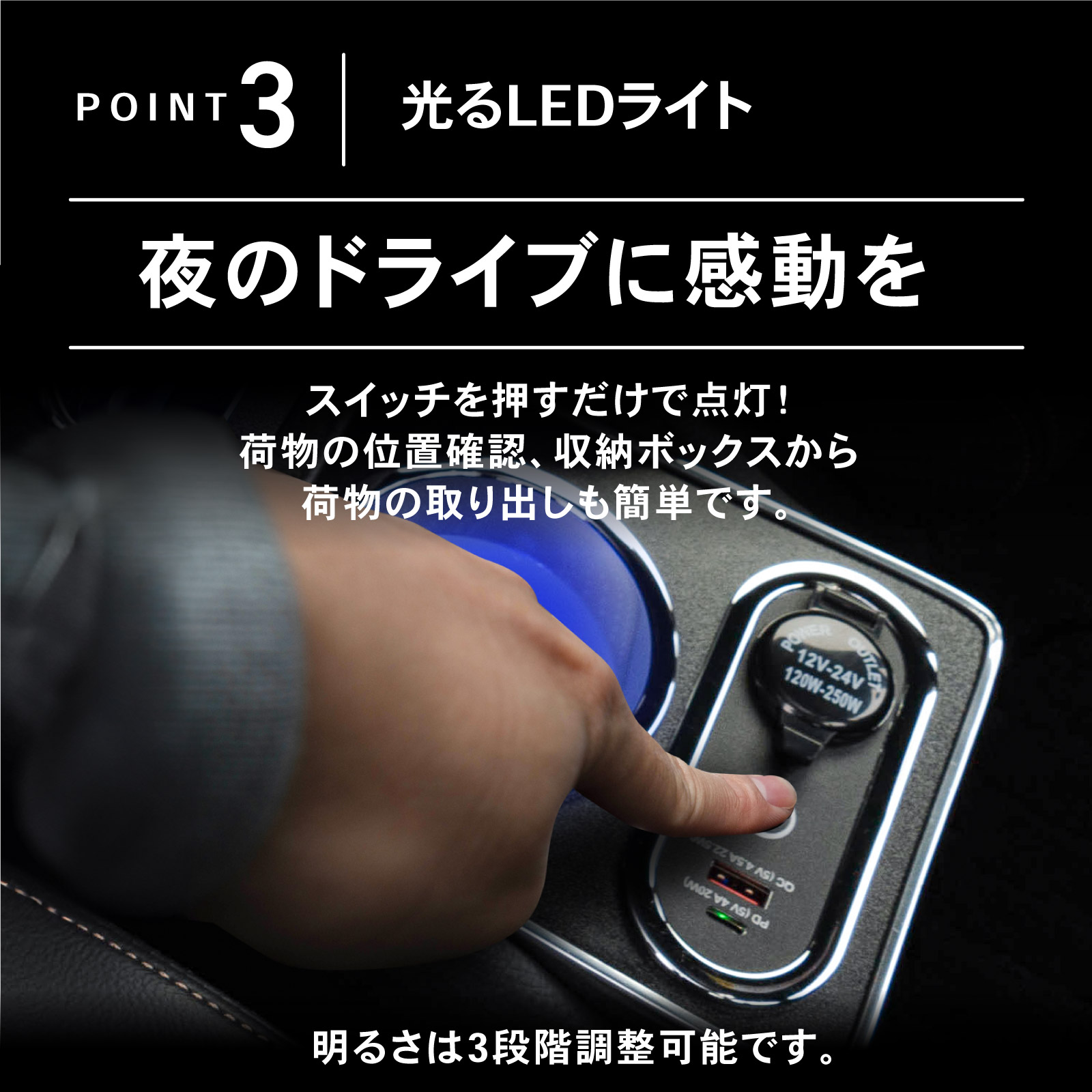 スイッチを押すだけで点灯し、車内の暗さにも対応します。