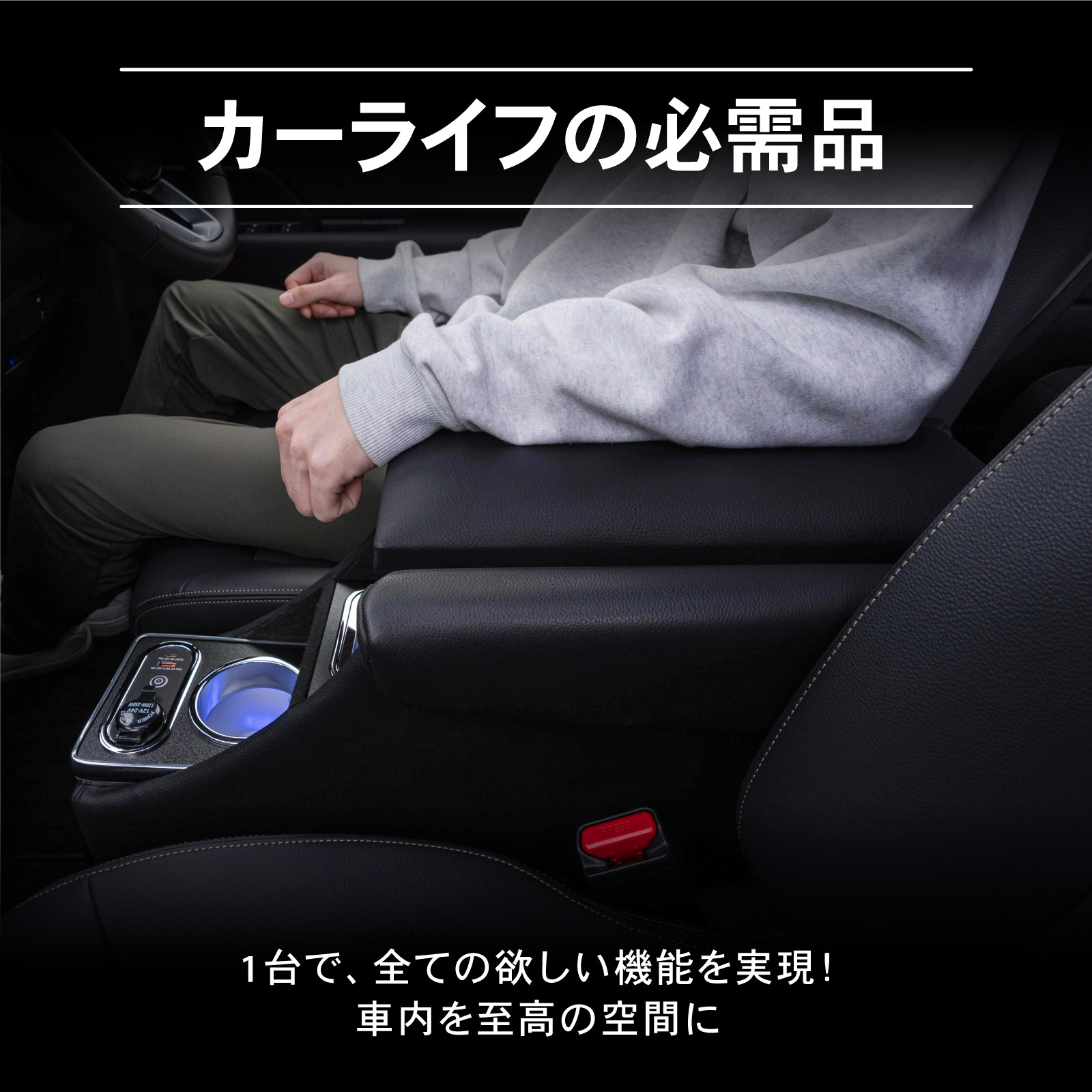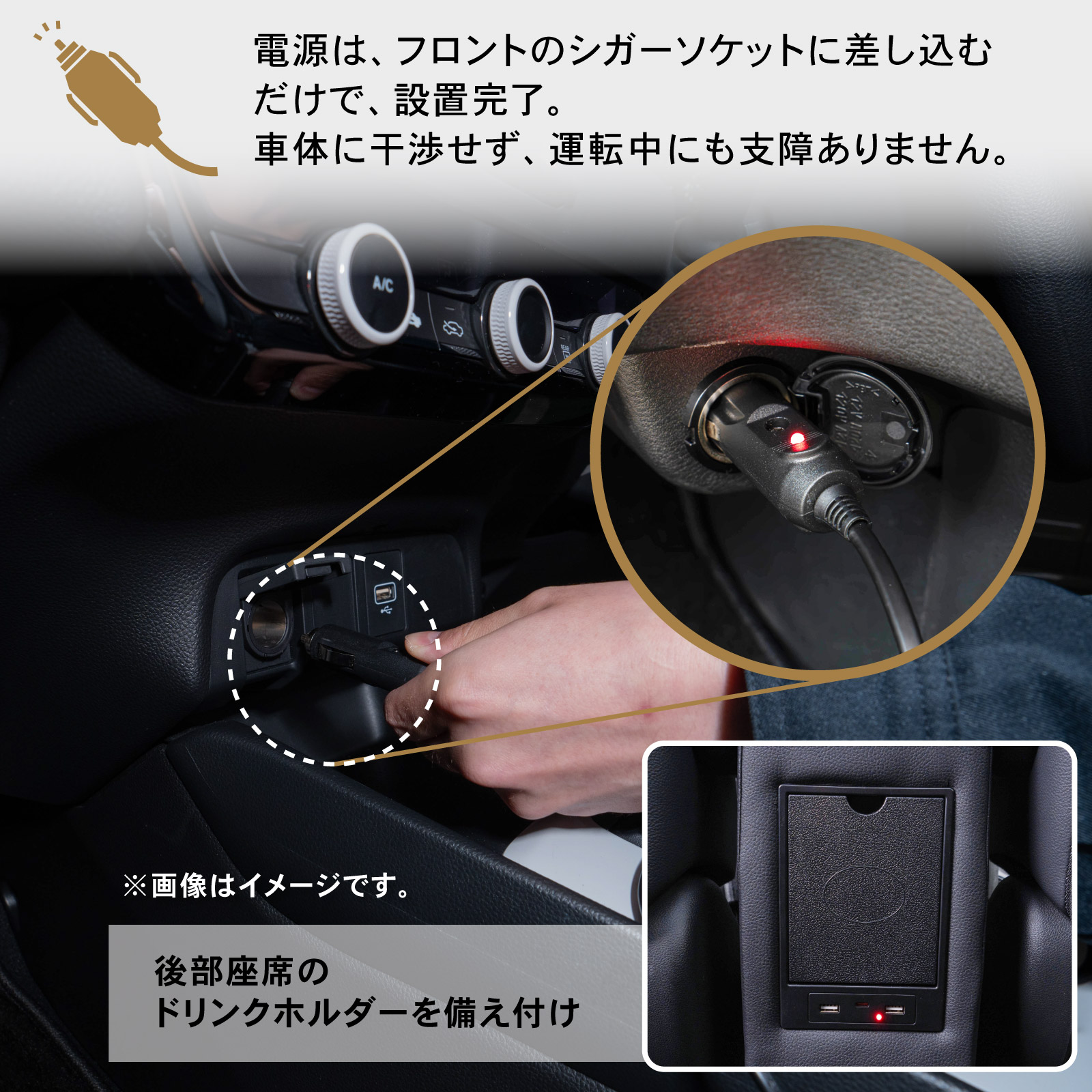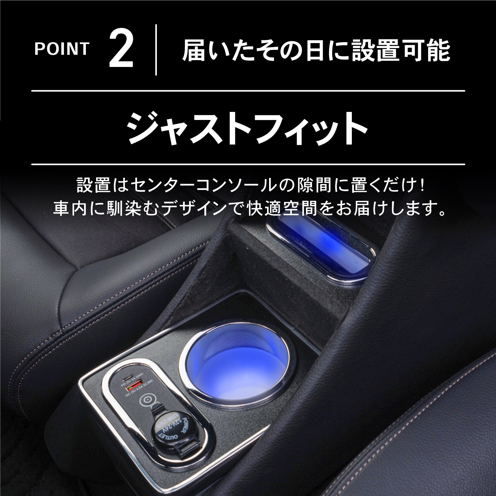 装着の際は座席・シートを後方へ倒しセンターコンソールにはめるだけでOKです。
