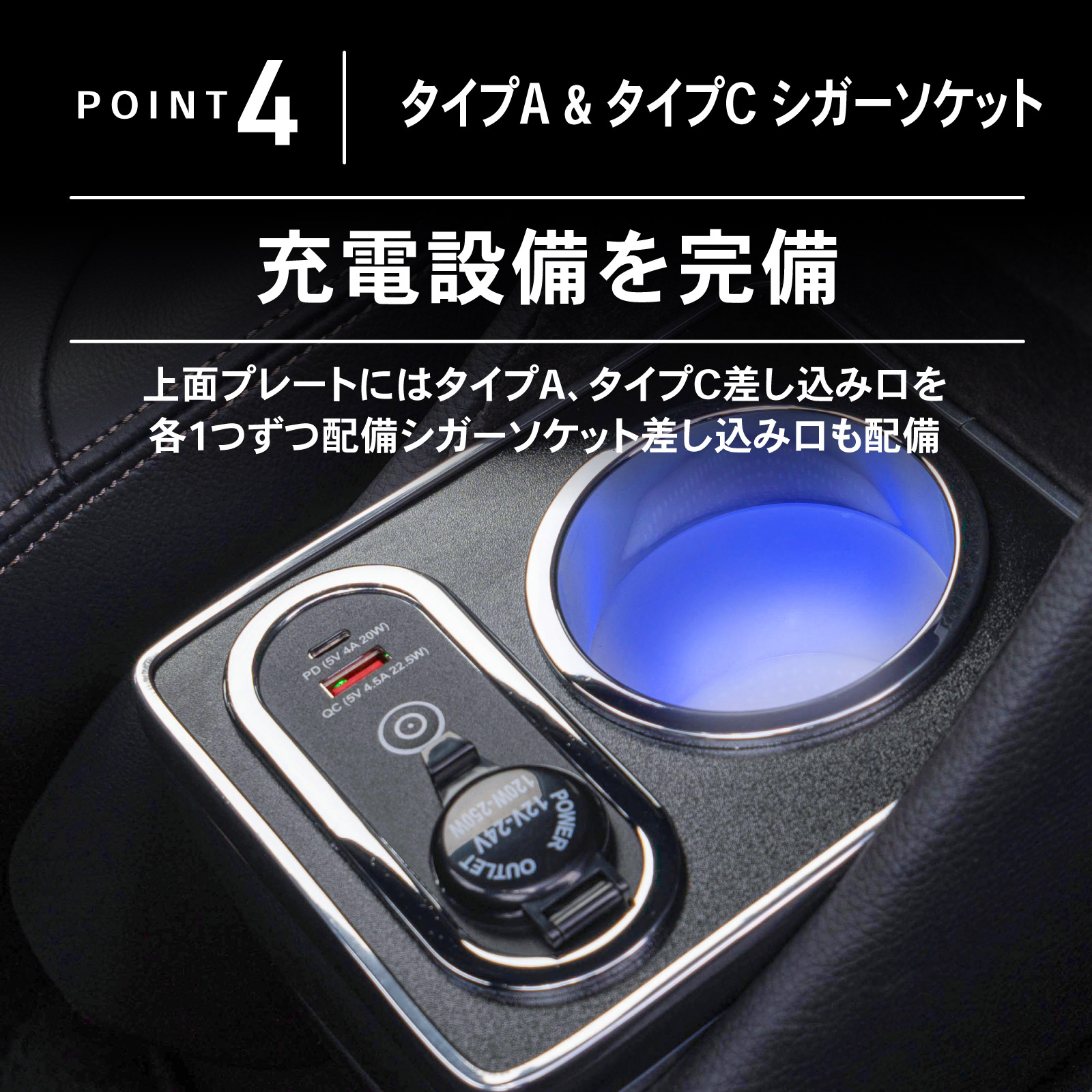 シガーソケットも配置しているため、電源には困りません。