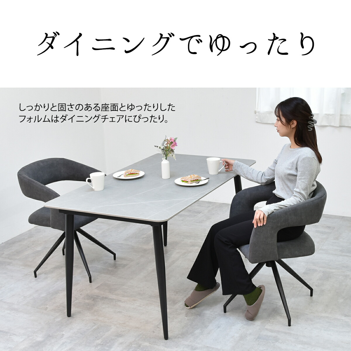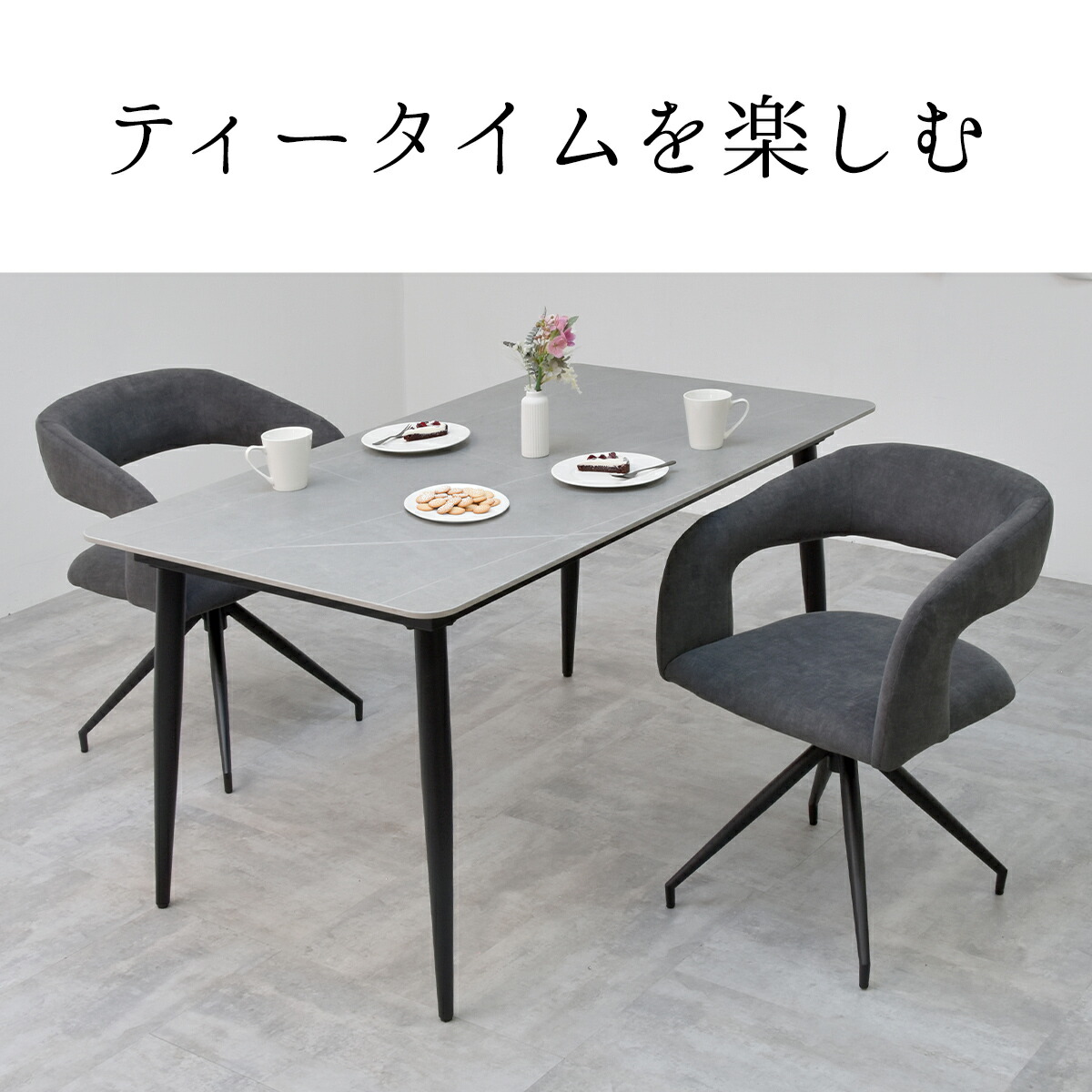 無機質な印象もあるのでシックなイメージや大理石調、セラミック系のテーブルにもピッタリ。