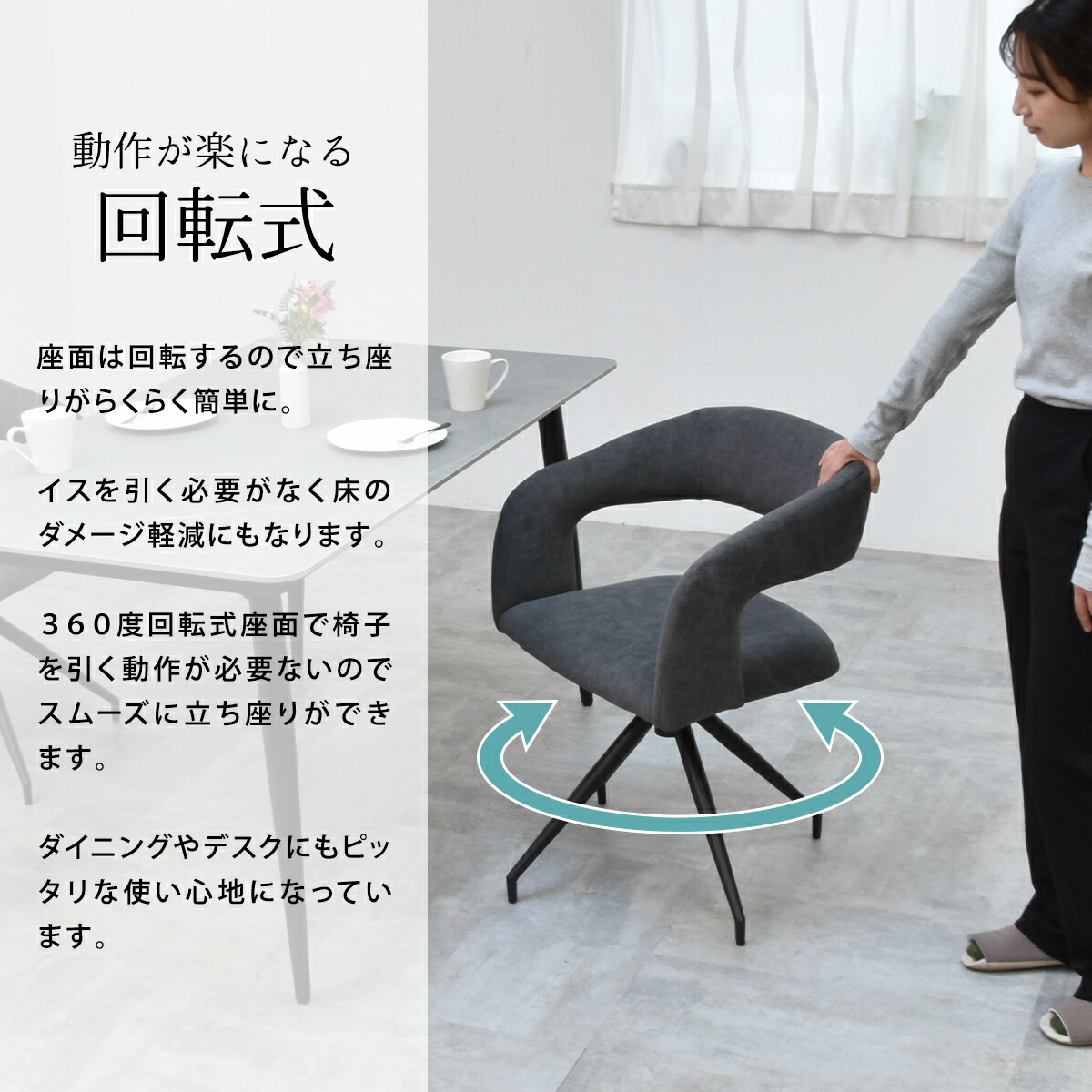 座面は回転式で、軽い力で動かせるので立ち座りの際もらくらく。