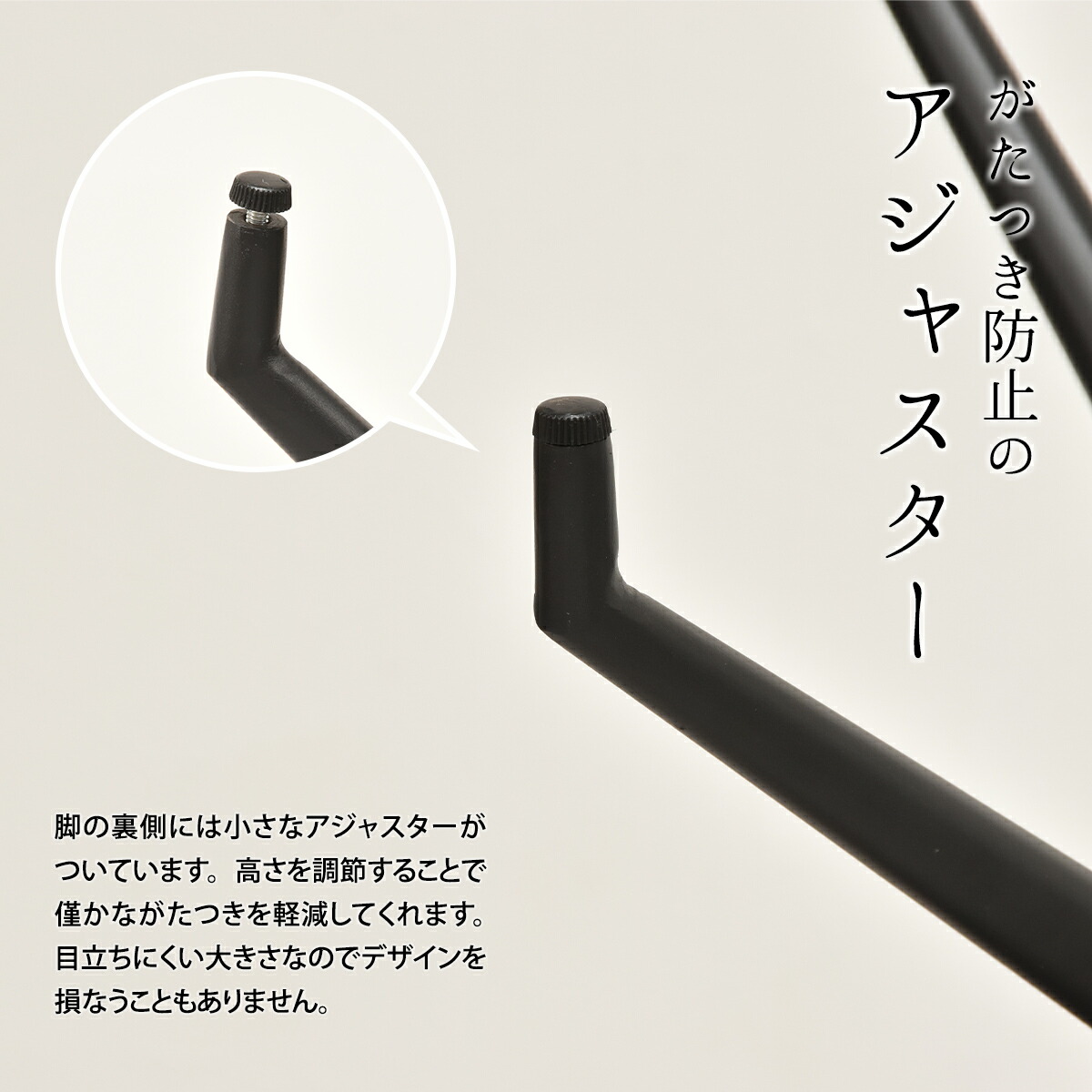 脚の先端には目立ちにくい大きさのアジャスターが付属。
