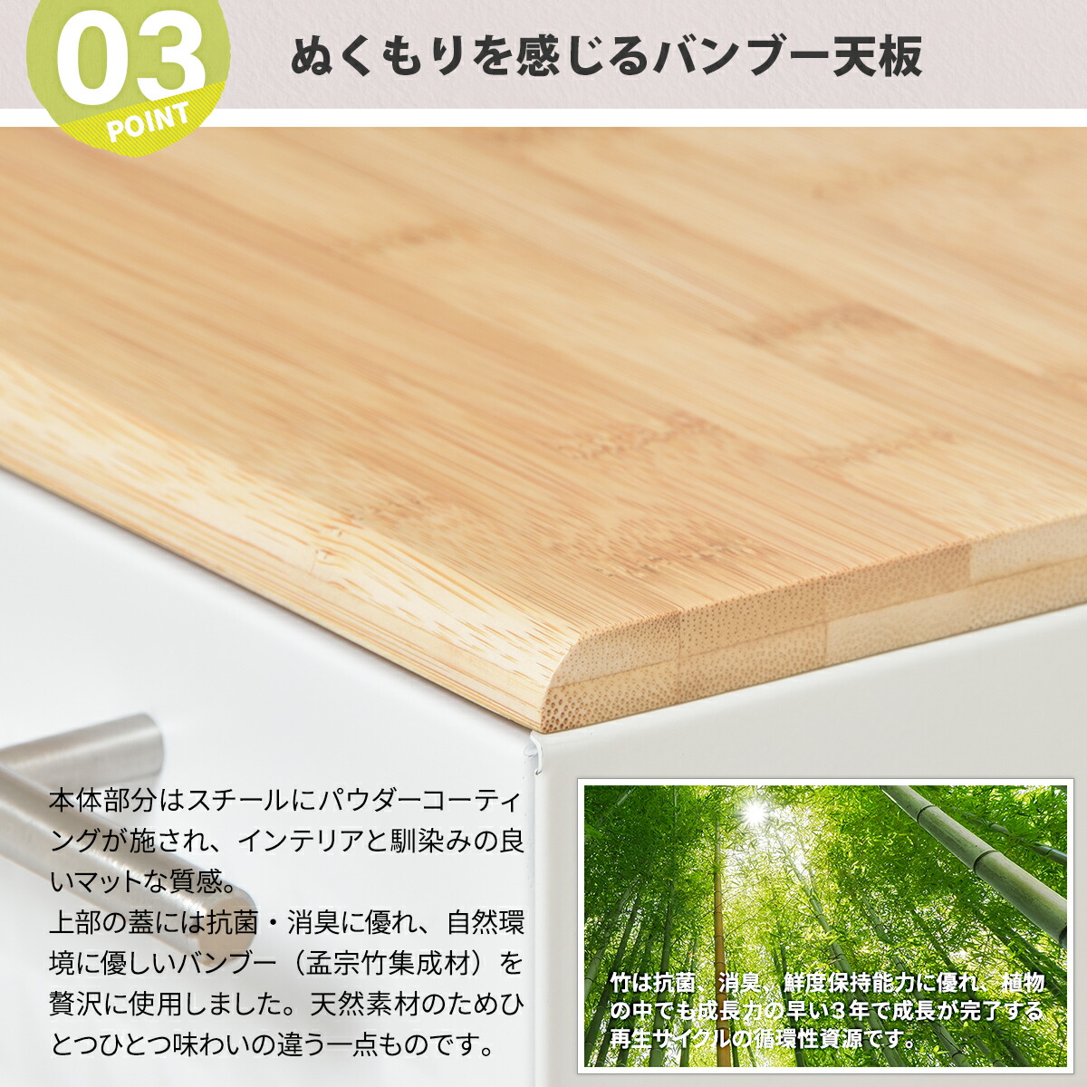 【本体・扉】スチール(エポキシ粉体塗装) 【天板】バンブー集成材(ラッカー塗装) 【取っ手】ステンレススチール
