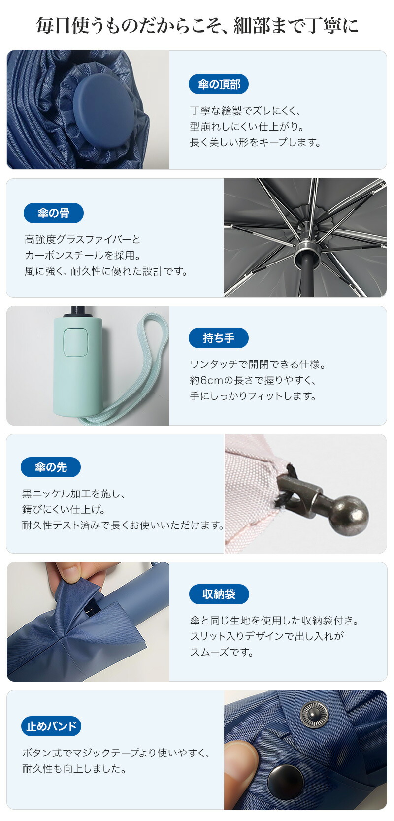 【8本のグラスファイバー骨】親骨に壁厚0.4mmのグラスファイバーを使用。耐久性としなやかさを兼ね備えております。受け骨の補強部分を特に太くしてあるため、軽量で錆びにくい上、弾力性に優れているため強風に煽られても折りにくい。