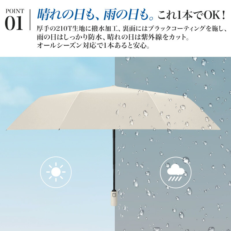 【晴雨兼用】夕立などの急な雨にも使え、一本あると便利です。降雨時のご使用においても防水性に優れているので雨の日、晴れの日兼用ご利用頂けます。毎日気軽に持ち歩けるよう、軽くてコンパクトなのも嬉しいポイントです。