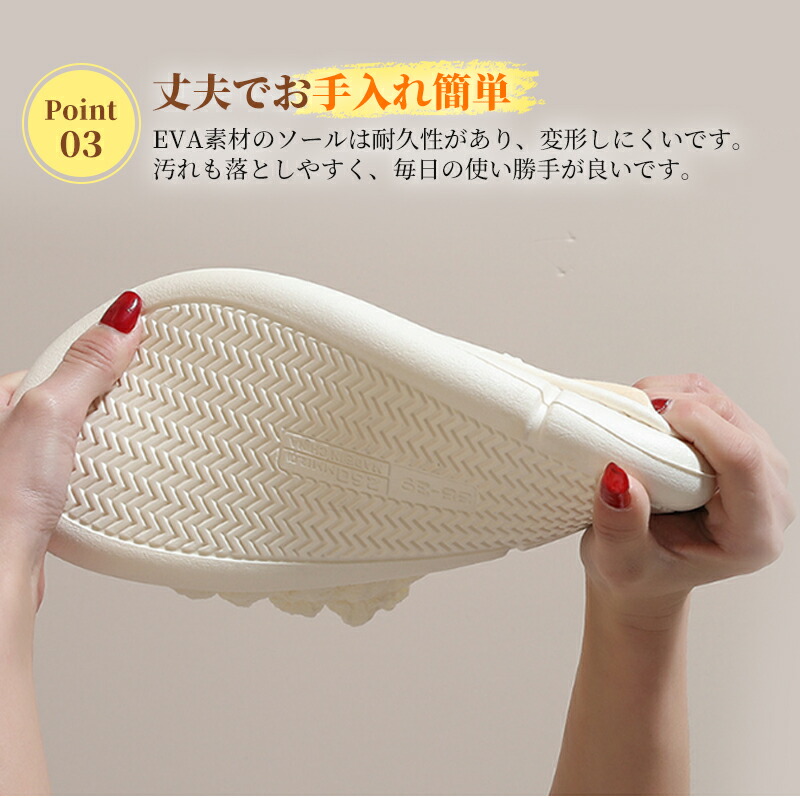 【ソフト、厚底】EVA素材を使用した軽量設計です。柔軟性があり、軽いソフトな履き心地とクッション性にも優れています。厚さ4cmの底もやわらかくクッション性の高いものに仕上げておりますので、履き心地もとても快適で、長時間使用しても疲れにくいです。