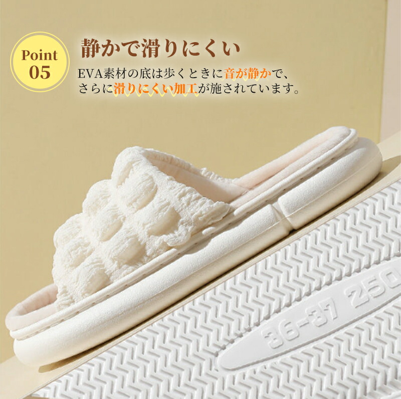 【静音タイプ】スリッパやサンダル特有のパタパタとする音が軽減されている静音タイプですので、マンションなどでも階下を気にされることなく、安心してご使用いただけます。
