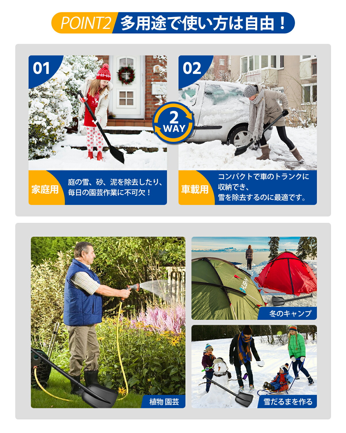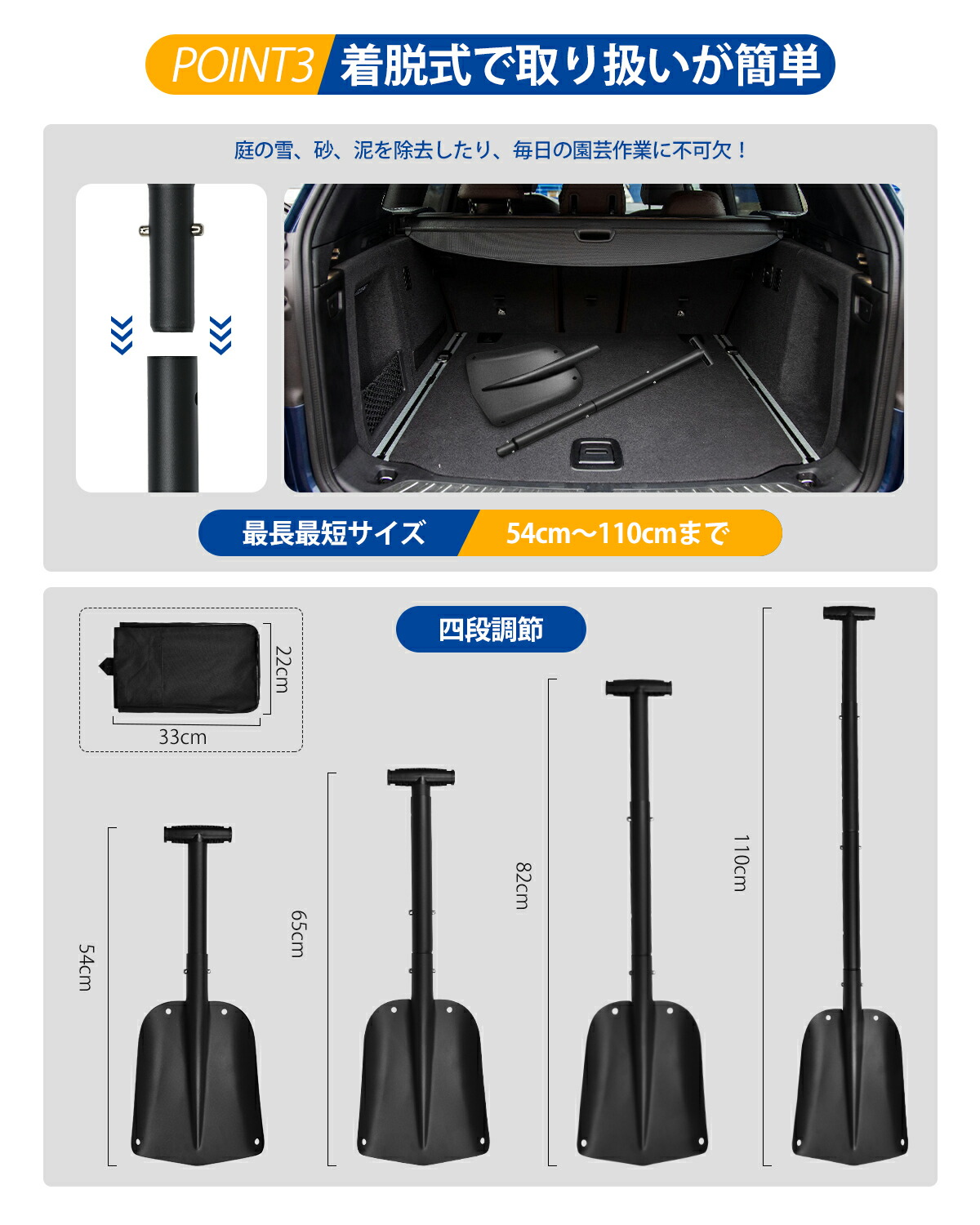 新発売!高品質アルミ合金を採用した組み立て式雪かきスコップです!長さを54cmから110cmまで4段階で調節できます。さまざまな身長に合わせて使えます。組み立て・分解・持ち運びが簡単なスノースコップです。本体は約588gと軽量なので、コンパクトで収納でき、お家の庭での除雪や園芸作業だけでなく、車載スコップとして、車のトランクに常備しておけば、急な降雪にも慌てずに対処できます。