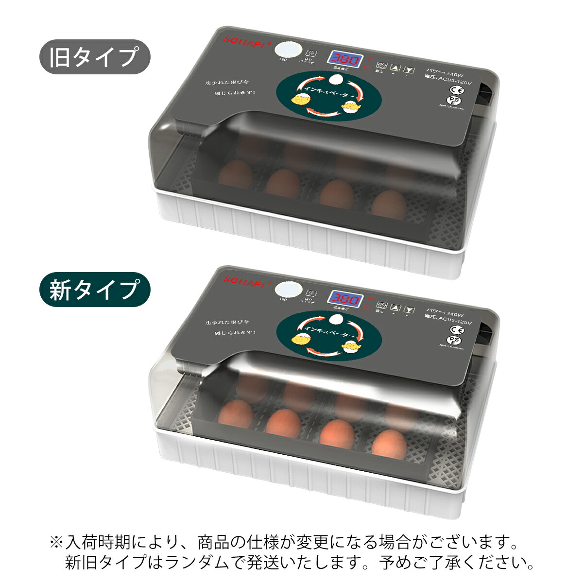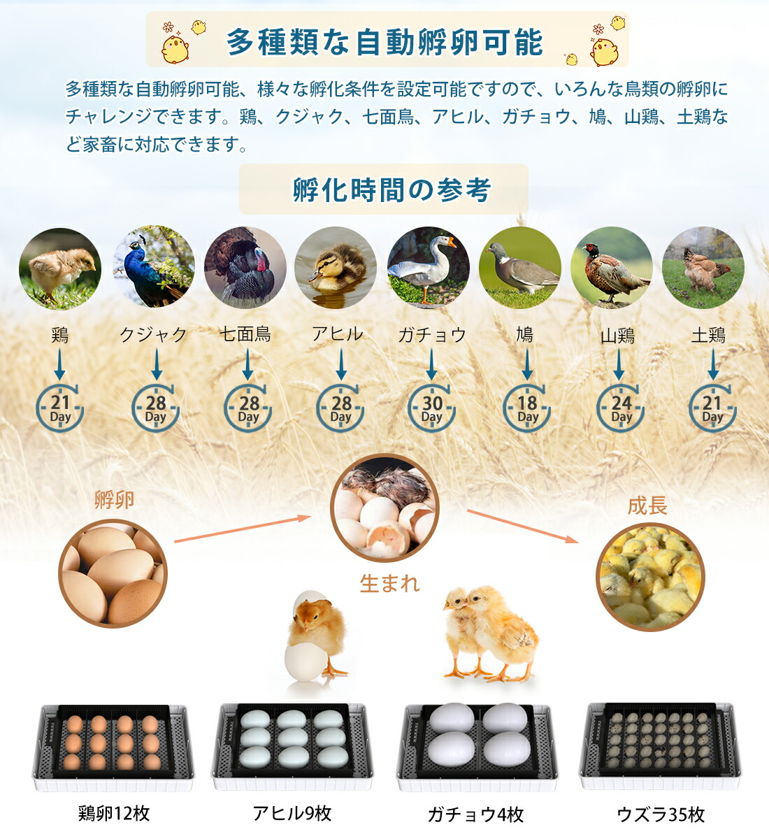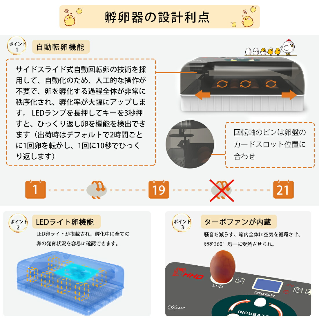 サイドスライド式自動回転卵の技術を採用し、自動化のため、人工的な操作が不要で、卵を孵化する全過程が秩序化されて(出荷時はデフォルトで2時間ごとに卵が1回転し、1回に10秒でひっくり回転します)。様々な孵化条件を設定可能ですので、いろんな種卵の孵卵にチャレンジできます。種卵の大きさによって、可能な孵化の数も違っています。ニワトリ12個、アヒル9個、ガチョウ4個、ピジョン卵24個、ウズラ卵35個など様々な種卵に対応できます。
