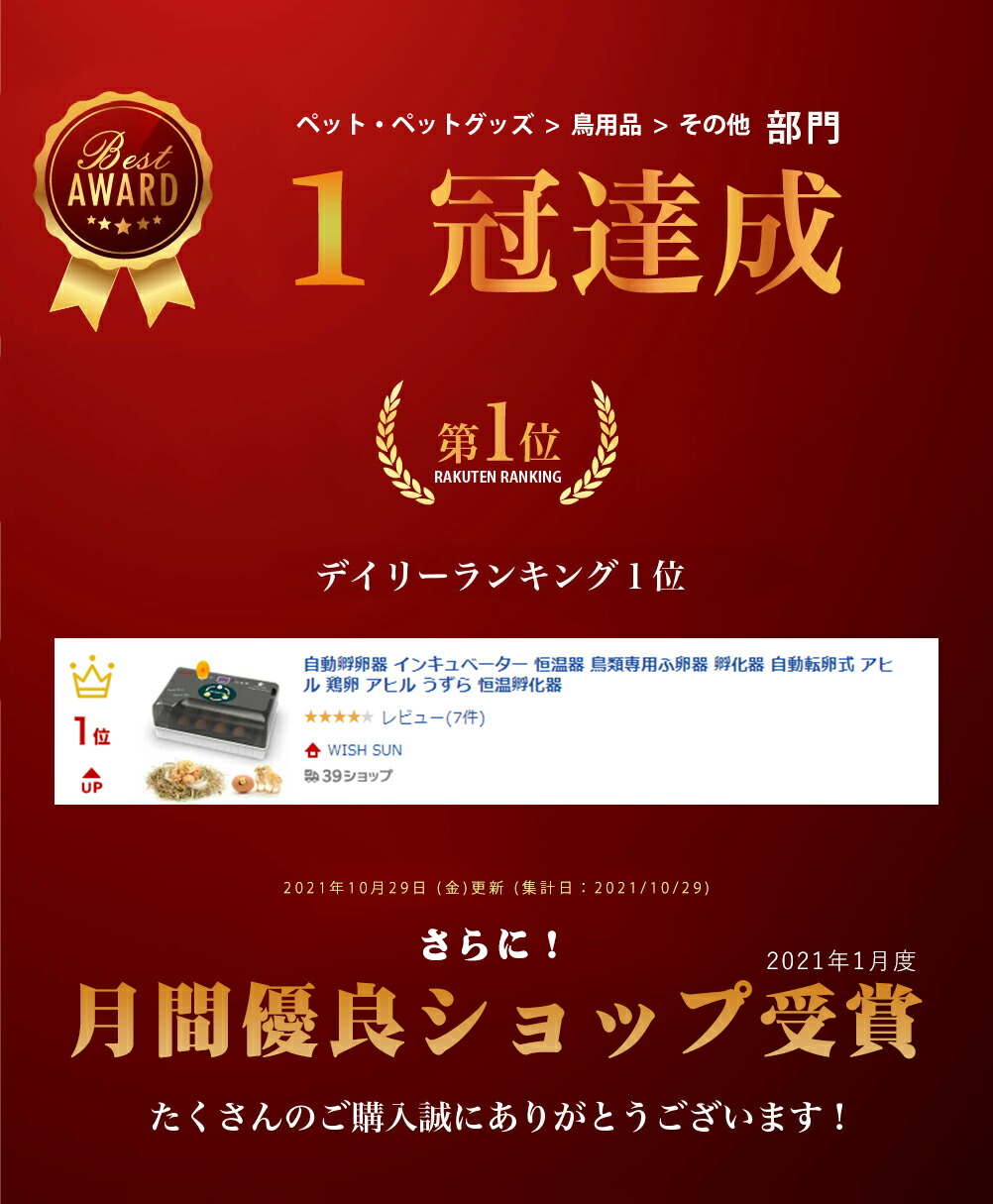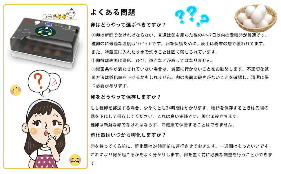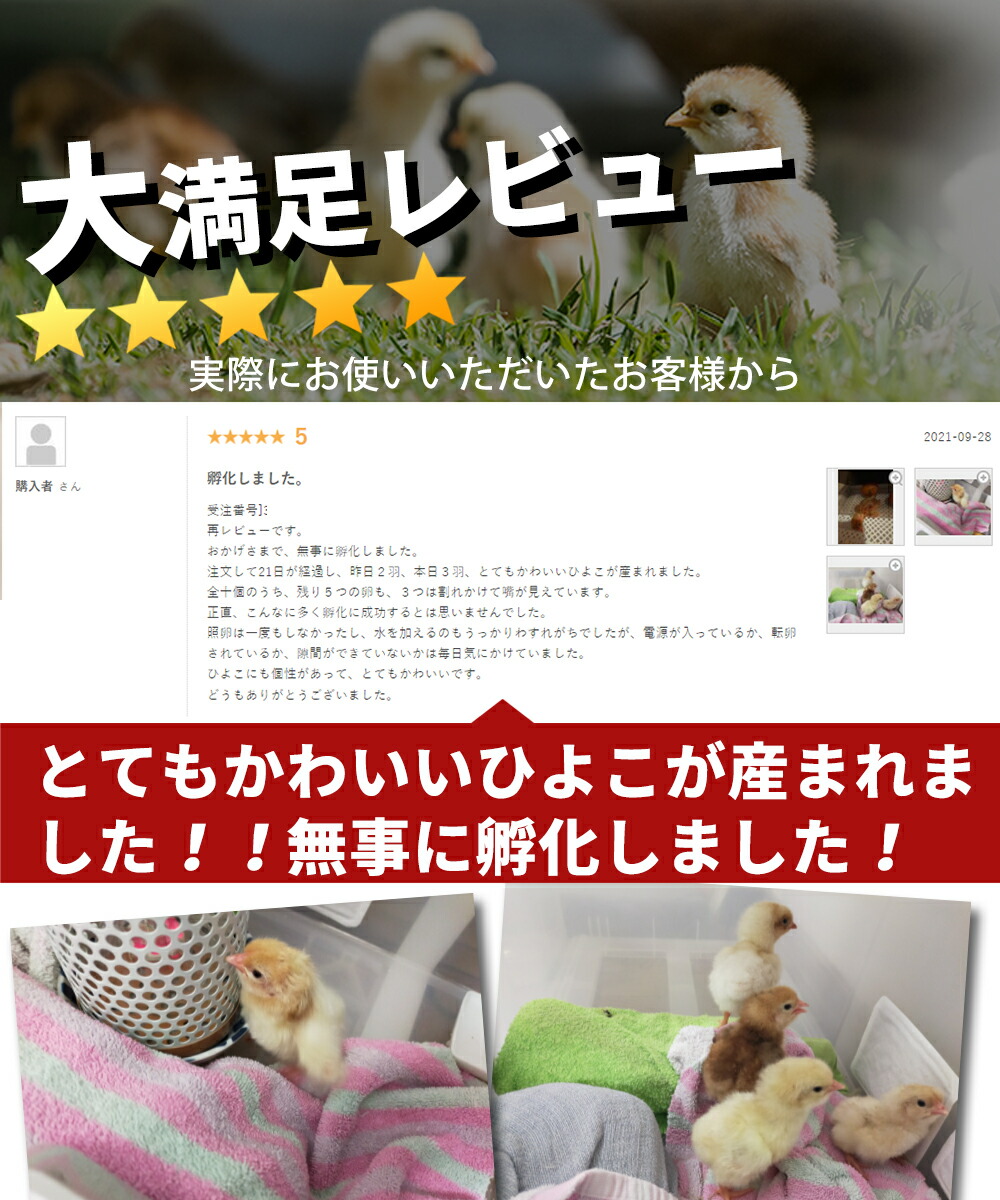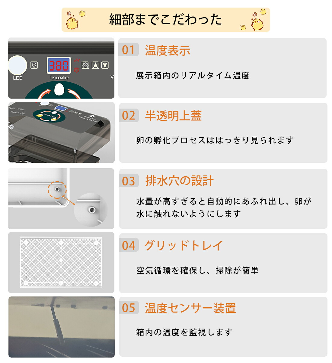 日本語の説明書が付いていますので、初心者の方でも使いやすいです。研究室、教学授業、家庭、実験室、子供教育などに適用性があります。子供たちは孵卵プロセス全体についてより多く学び、子供たちの好奇心を育むことができます。お子様と一緒にひよこを孵化させて観察したり、生き物の命の尊さを学ぶ教材として当製品はおすすめです。