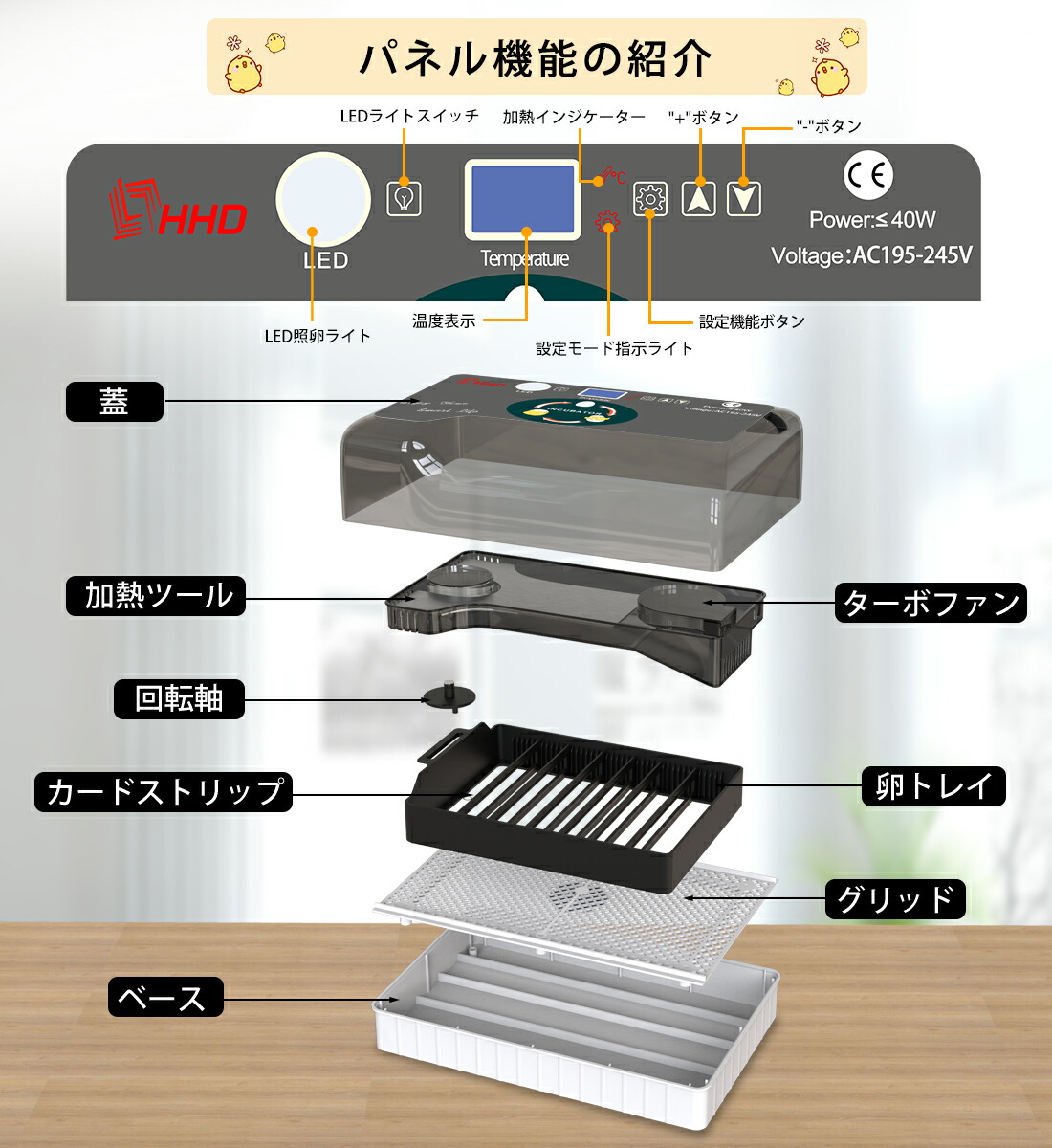 騒音を減らすファンが内蔵しており、箱内全体に空気を循環させ、卵を360°均一に受熱させられ、孵化率が大幅にアップします。卵の最適な孵化温度は20℃~40℃で、孵化温度はLEDディスプレイに表示されます、孵化の温度を正しくコントロールできます。蓋が取り外しやすく、また半透明の状態です、卵の孵化プロセスははっきり見られます。