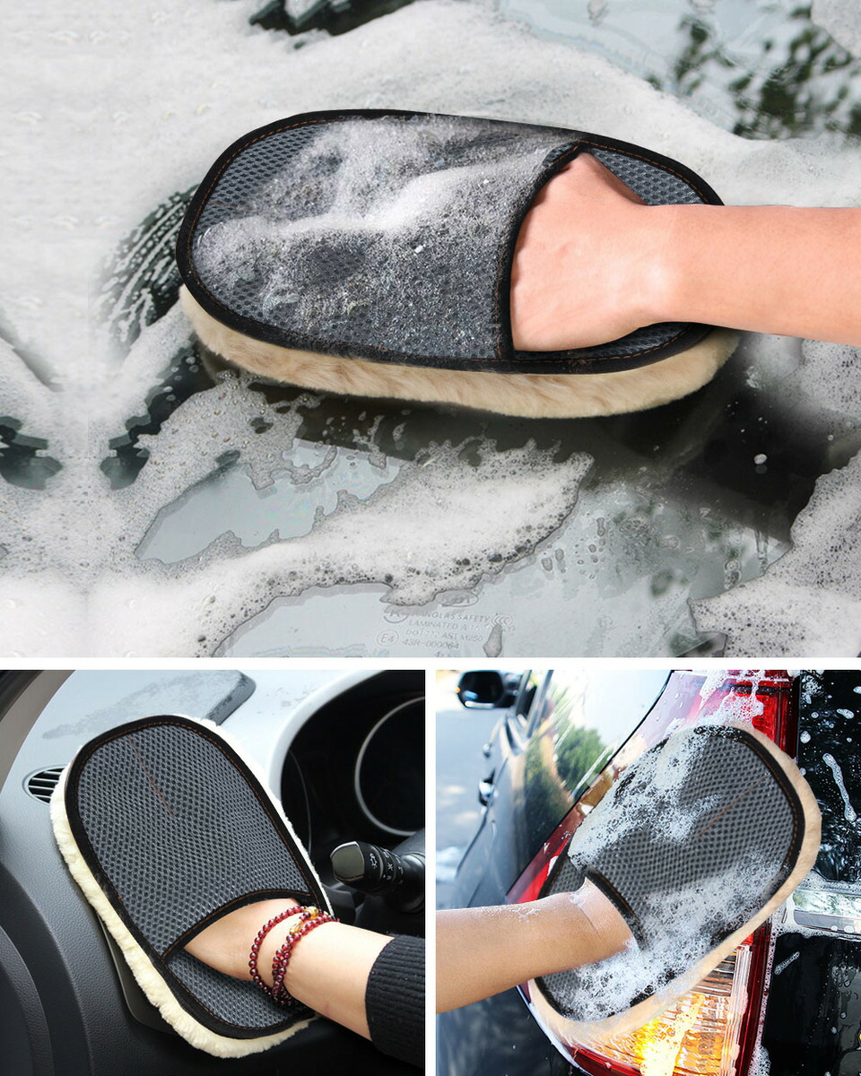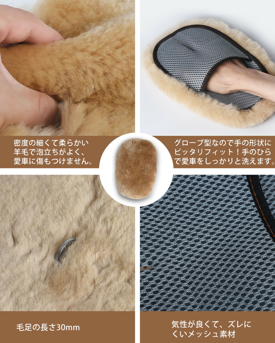 洗車用ムートングローブサイズ:約25CM*18CM(厚さ約3CM!)。ボリュームのある羊毛で、スピーディーな洗車が可能です。羊毛部までの面積が広く(一般的なスポンジの約2倍!)、羊毛量もUP、洗車が楽になります。側面まで羊毛でカバーすることにより、狭い箇所の洗車にも最適です。天然羊毛の力でしっかり汚れや曇りなどを拭き取り、愛車をピカピカにします。洗車以外にも、家事用、家電製品・家具・窓ガラス・鏡・キッチンのお掃除など、日常生活の幅広いシーンでご使用いただけます。