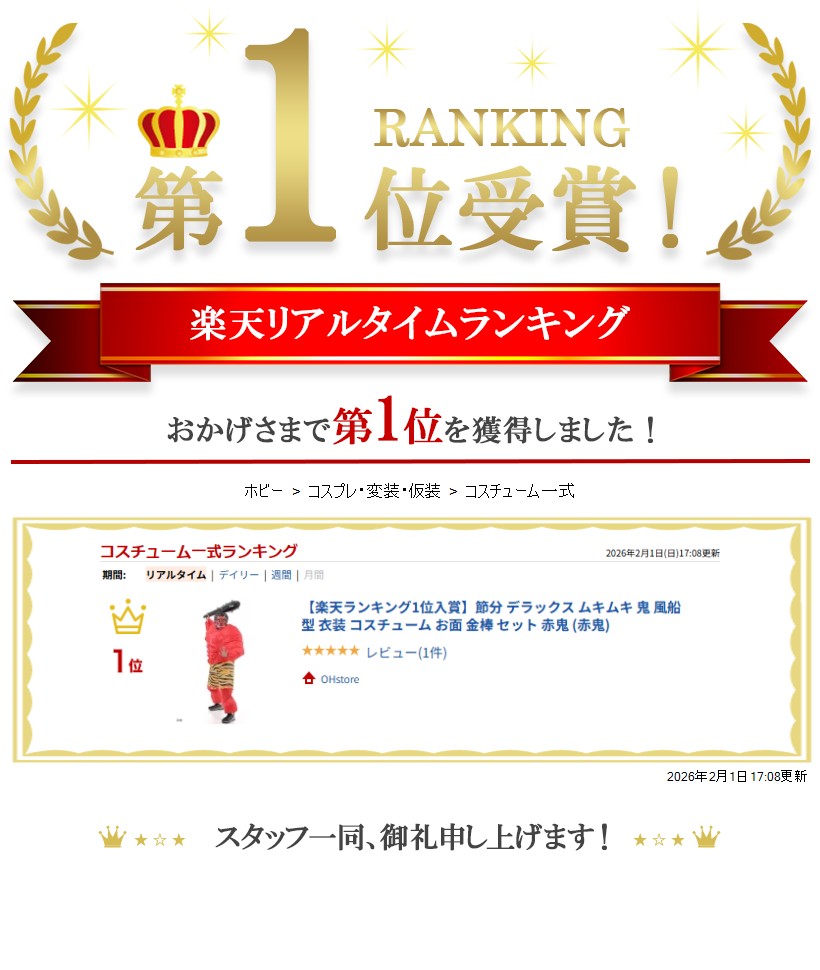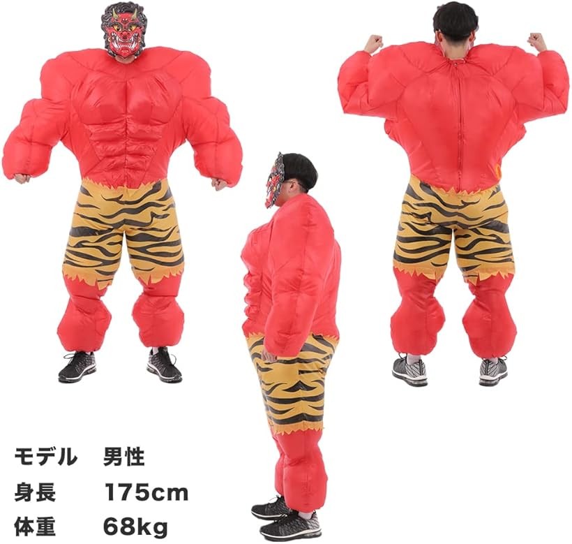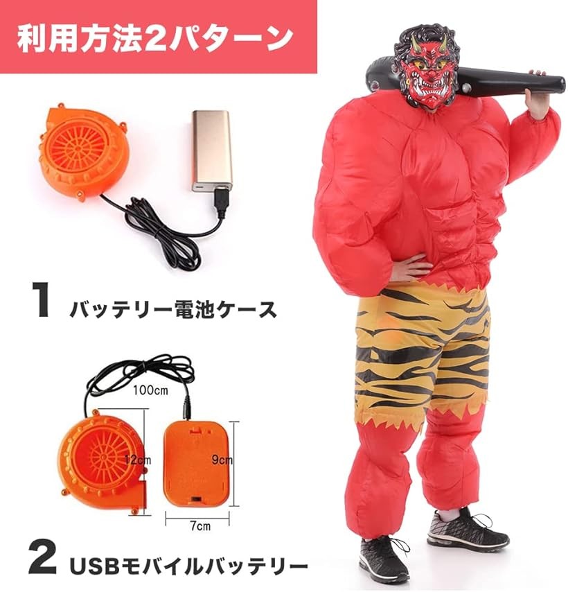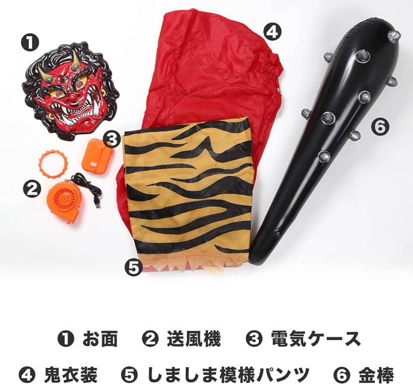 ・お面や金棒を合わせて着用すれば、全身超立体的な鬼に変身できる、迫力満点かつ愉快なコスチュームです。