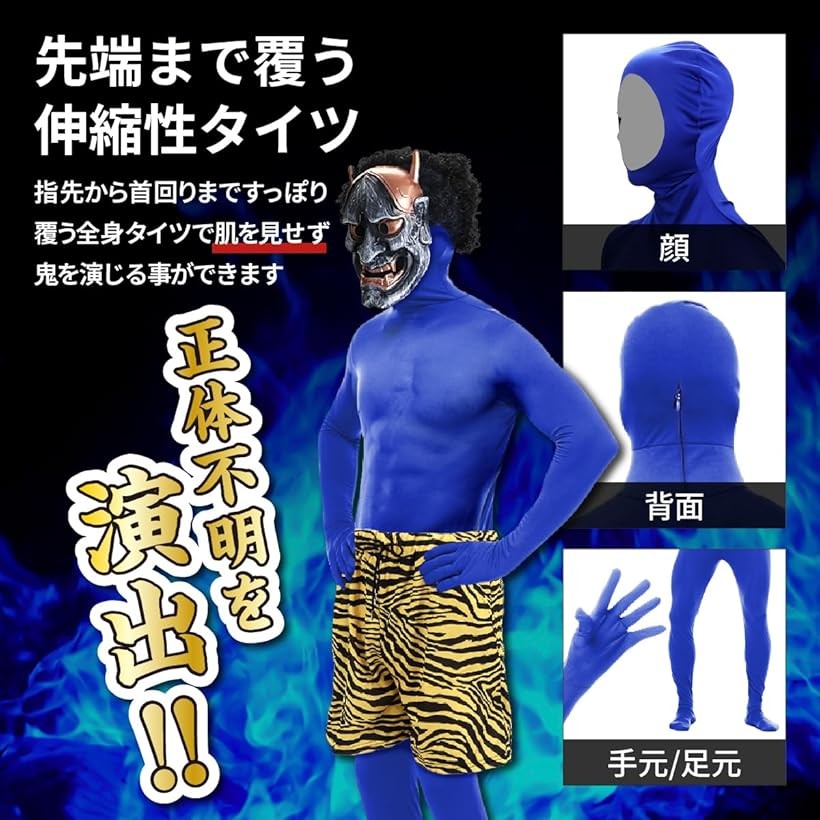 肌見えゼロ 節分用衣装 鬼コスチューム 5点フルセット 全身タイツ ウィッグ付き 棍棒 虎柄パンツ お面