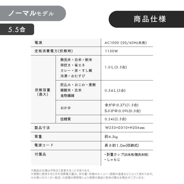 炊飯器 3合 3合炊き 5.5合 5合 ノーマルモデル コンパクトモデル 3合 5.5合