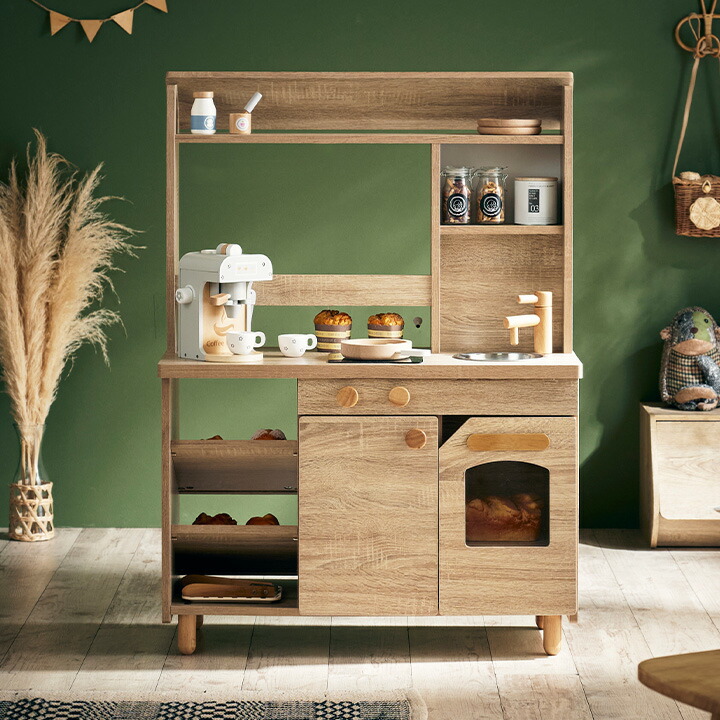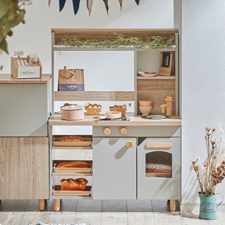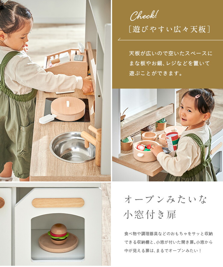 食べ物や調理器具などのおもちゃをさっと収納できる収納棚と、小窓が付いた開き扉。小窓から中が見える扉は、まるでオーブンみたい!