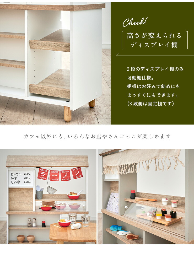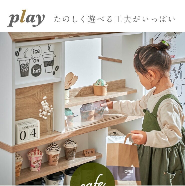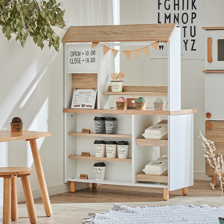 たくさん並べることができるディスプレイ棚は、並べるものをかえていろんなお店やさんごっこが楽しめます。