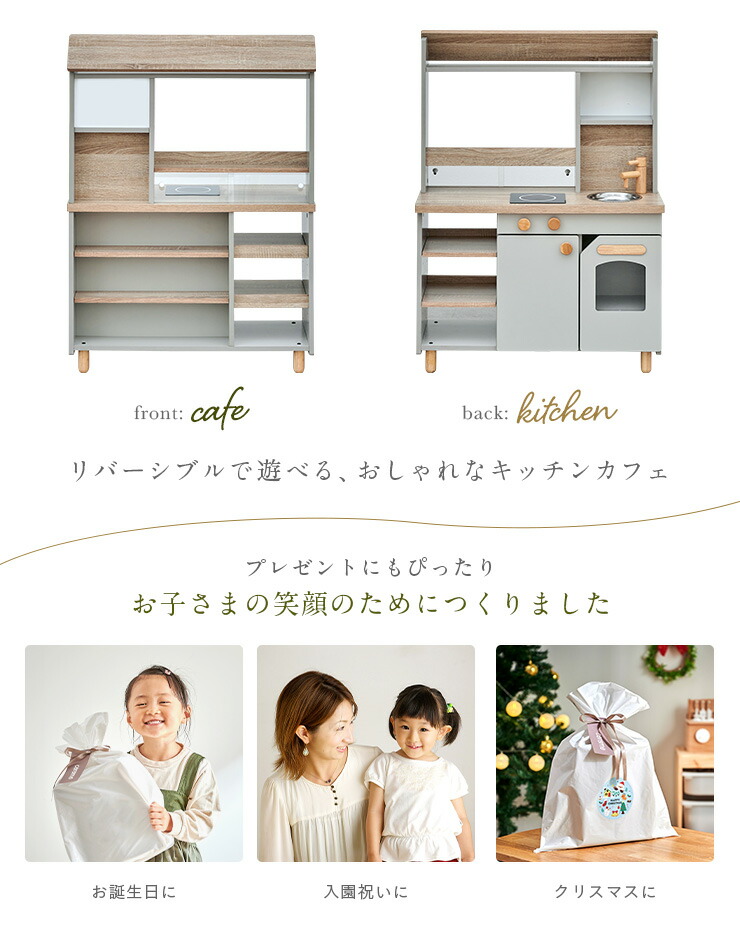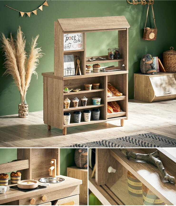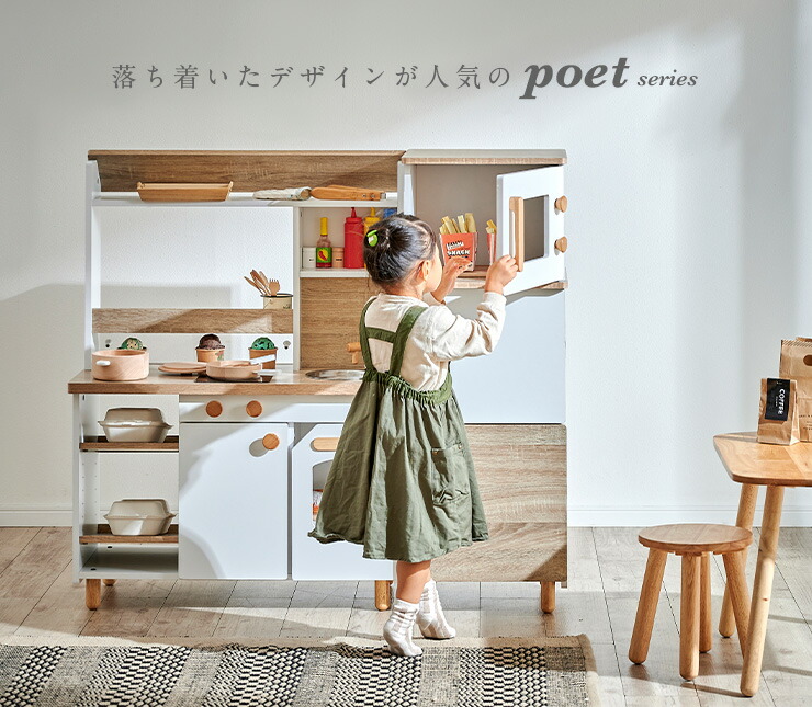 落ち着いたデザインが人気のpoet seriesからリバーシブルで遊べるcafeが登場!お料理をしたり、お店やさんになりきったり、こどものいちばん身近なごっこ遊びであるおままごと。そんなおままごとの夢が叶うリバーシブルで遊べるキッチンカフェを作りました。インテリアとの相性も考えたおしゃれなデザインで、女の子はもちろん男の子にもおすすめの商品です。