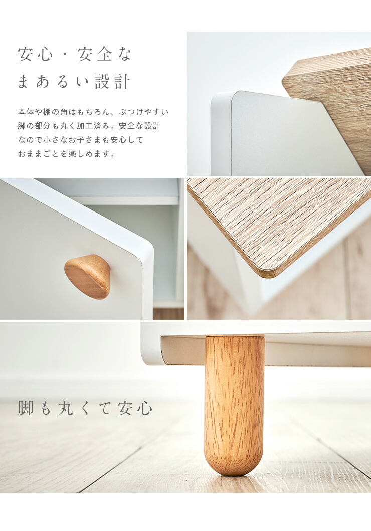 本体や棚の角はもちろん、ぶつけやすい脚の部分も丸く加工済み。安全な設計なので小さなお子さまも安心しておままごとを楽しめます。