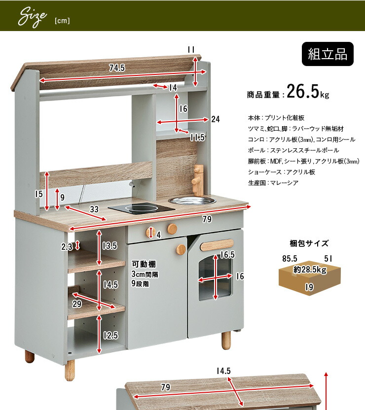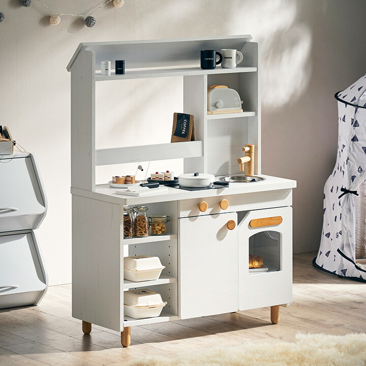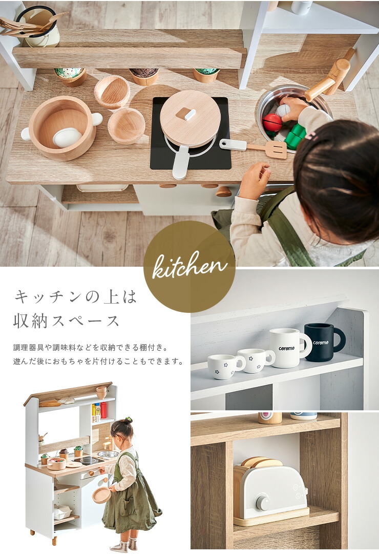 調理器具や調味料などを収納できる棚付き。遊んだ後におもちゃを片付けることもできます。