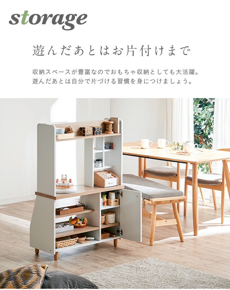 収納スペースが豊富なのでおもちゃ収納としても大活躍。遊んだあとは自分で片づける習慣を身につけましょう。