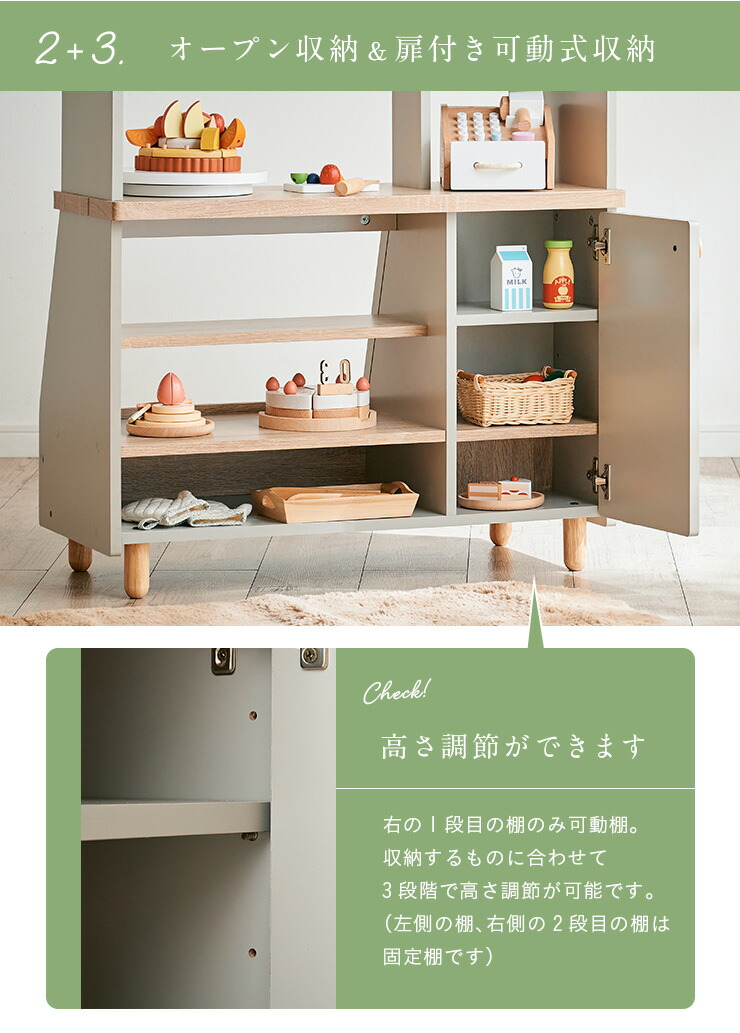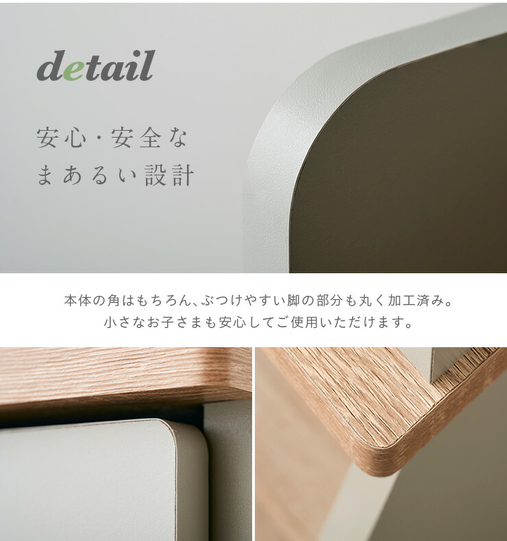 本体や棚の角はもちろん、ぶつけやすい脚の部分も丸く加工済み。安全な設計なので小さなお子さまも安心しておままごとを楽しめます。