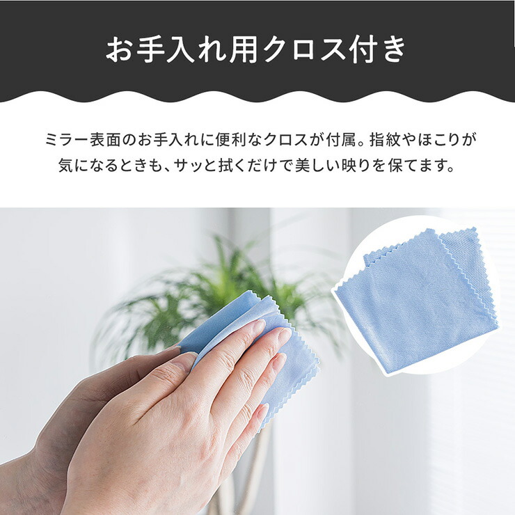 ミラー表面のお手入れに便利なクロスが付属。指紋やほこりが気になる時も、サッと拭くだけで美しい映りを保てます。