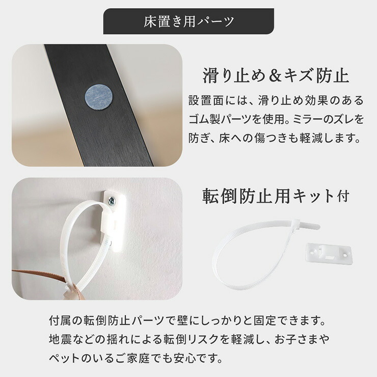 滑り止め&キズ防止:設置面には、滑り止め効果のあるゴム製パーツを使用。ミラーのズレを防ぎ、床への傷つきも軽減します。