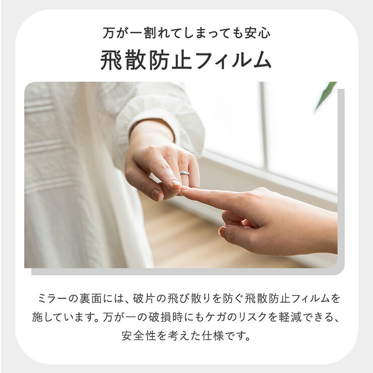 ミラーの裏面には、破片の飛び散りを防ぐ飛散防止フィルムを施しています。万が一の破片時にもケガのリスクを軽減できる、安全性を考えた仕様です。