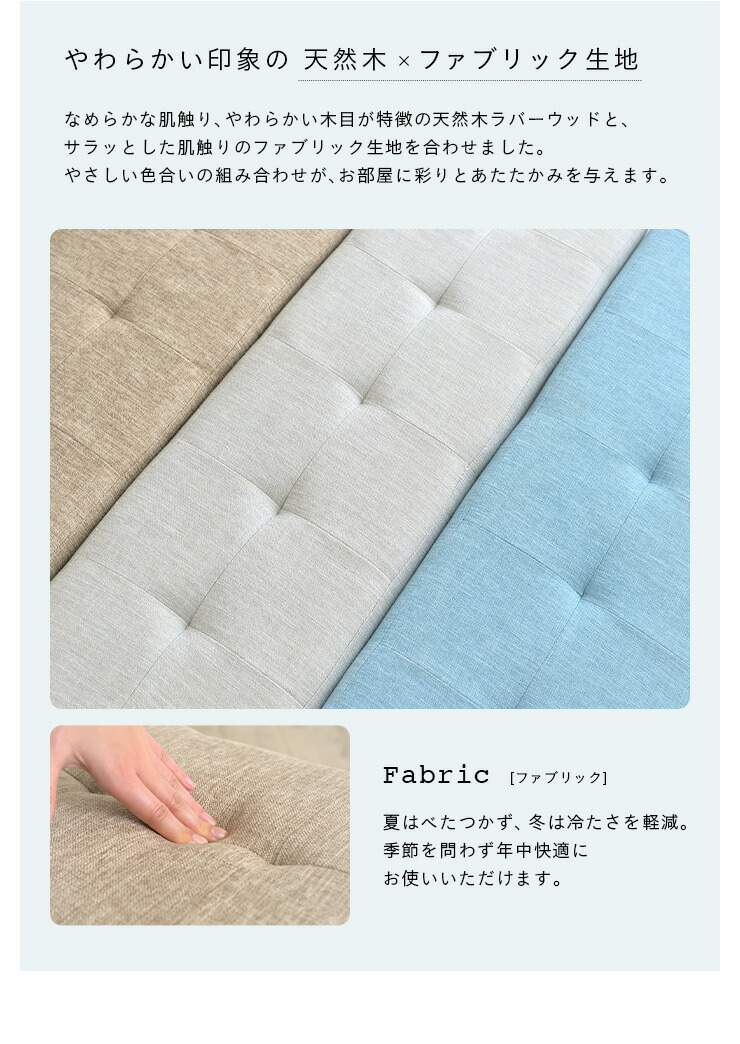 なめらかな肌触り、やわらかい木目が特徴のラバーウッドと、サラッとした肌触りで年中快適に過ごせるファブリック生地を合わせました。やさしい色合いの組み合わせが、お部屋に彩りとあたたかみを与えます。