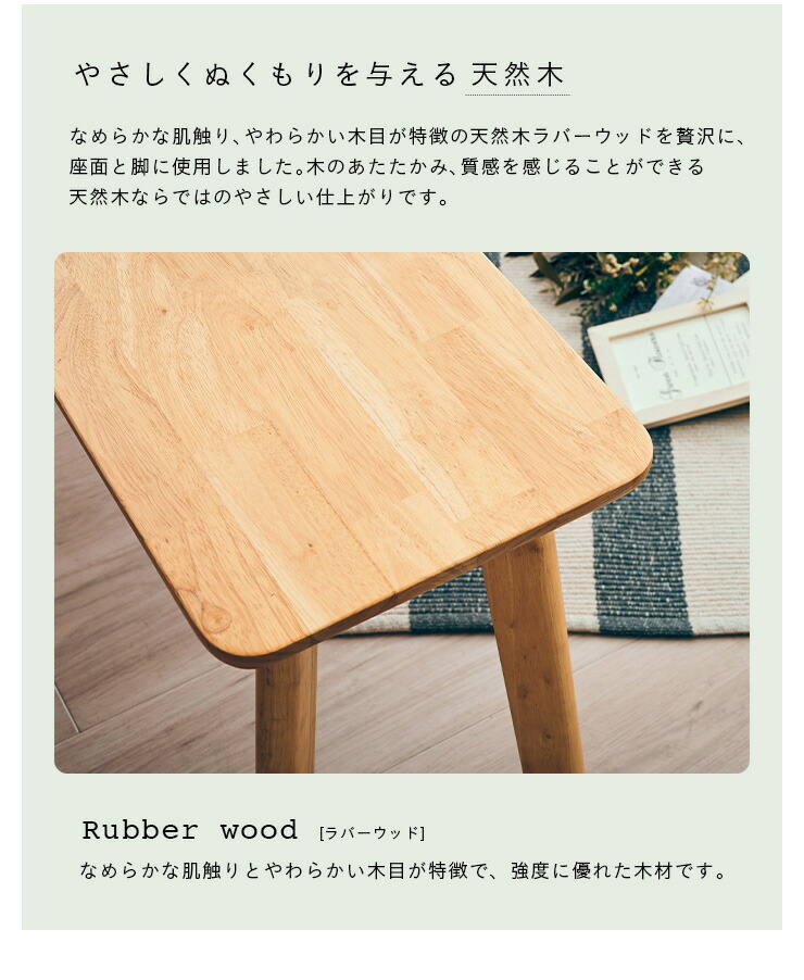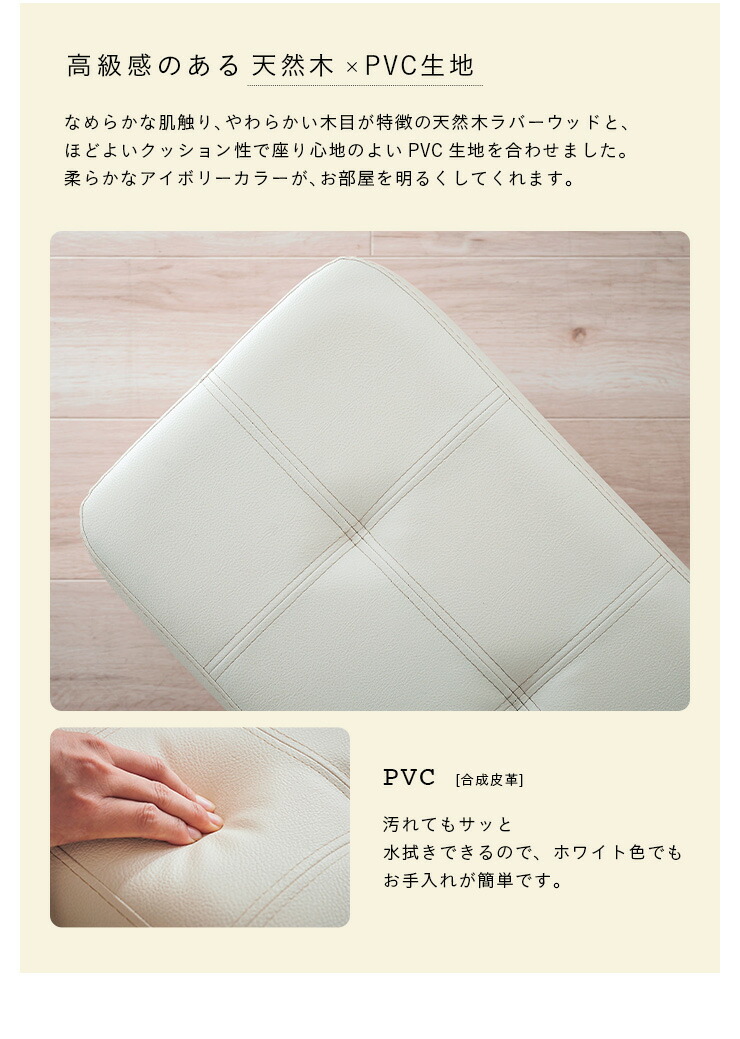 なめらかな肌触り、やわらかい木目が特徴のラバーウッドと、ほどよいクッション性で座り心地のよいPVC生地を合わせました。柔らかなホワイトカラーが、お部屋を明るくしてくれます。