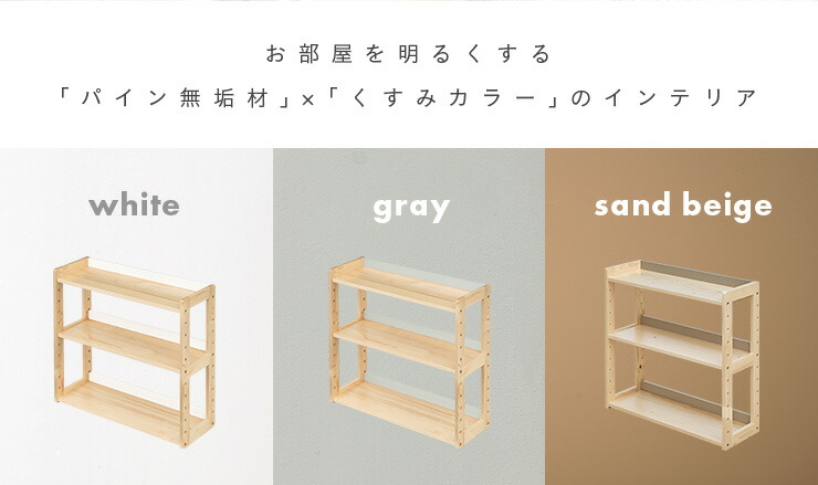 パイン材のあたたかい雰囲気に合わせたポイントカラーを3色ご用意。やわらかさを出すためにくすみカラーを採用。当店こだわりのオリジナルカラーです。