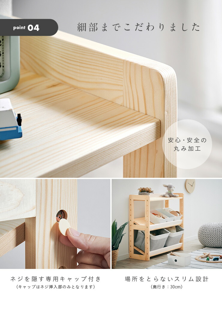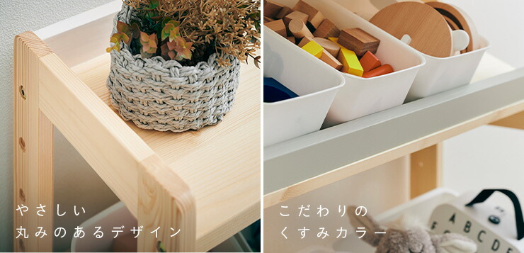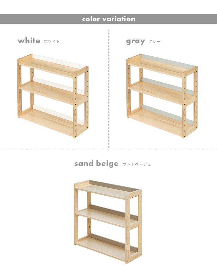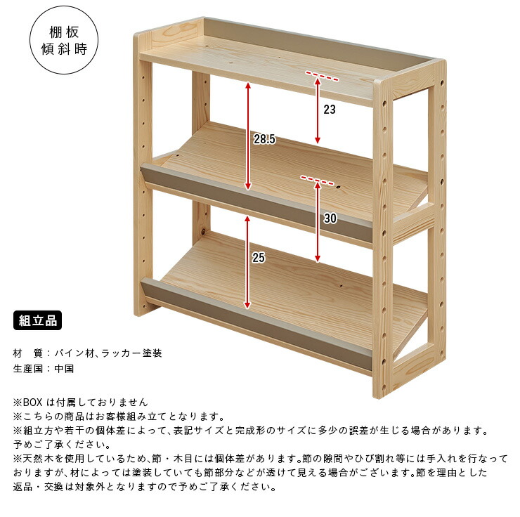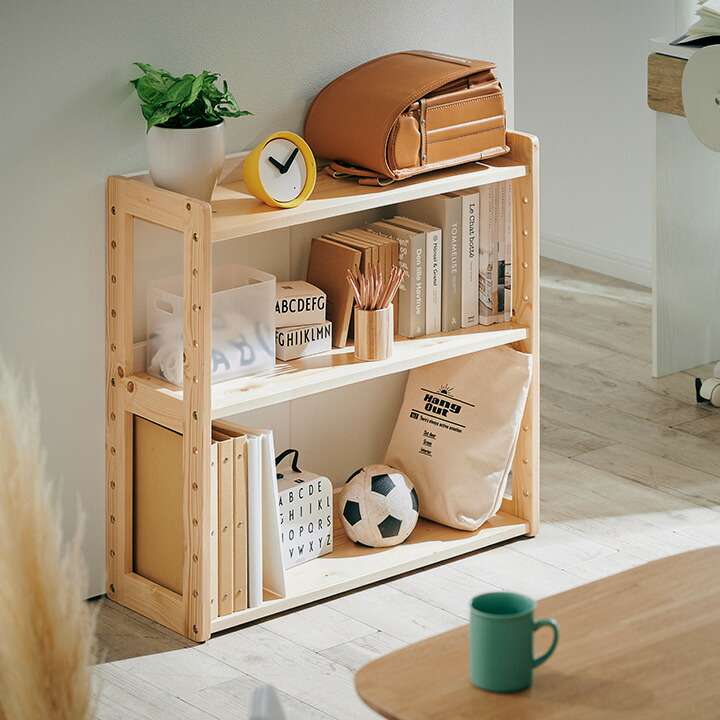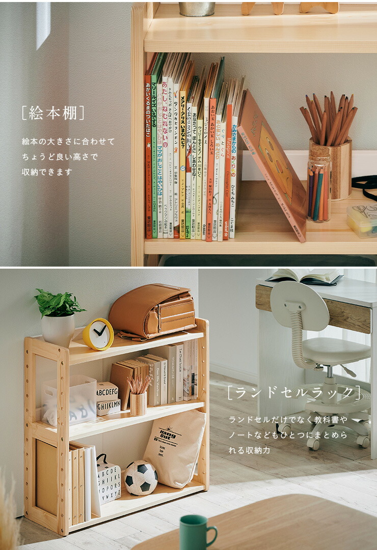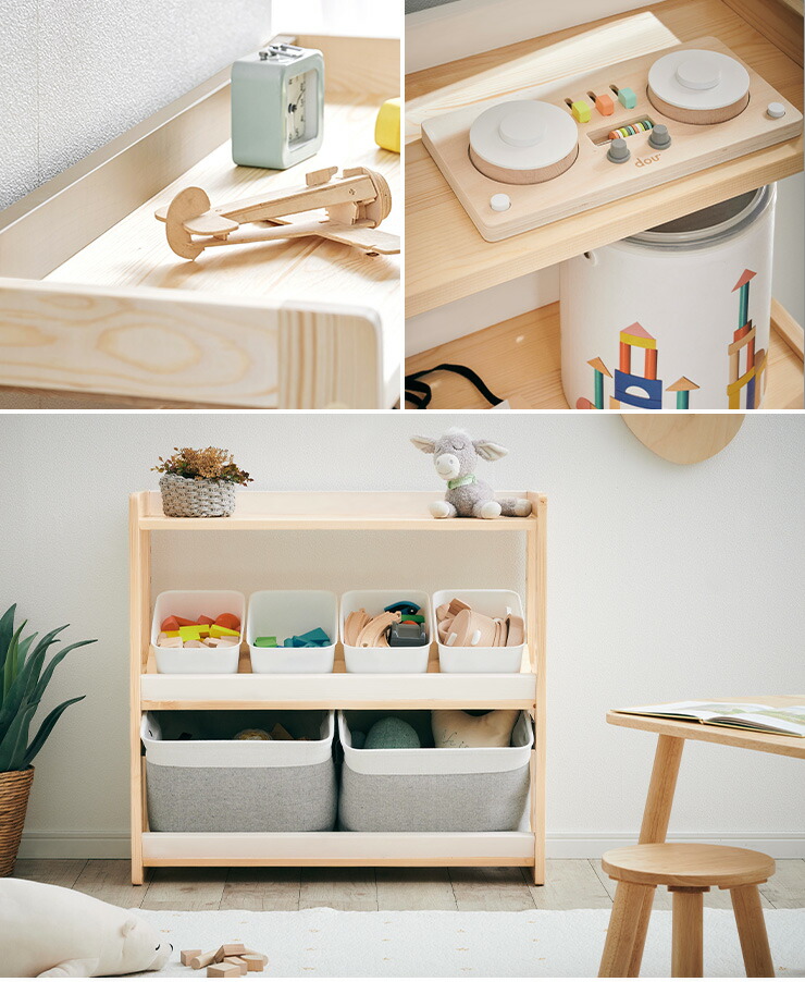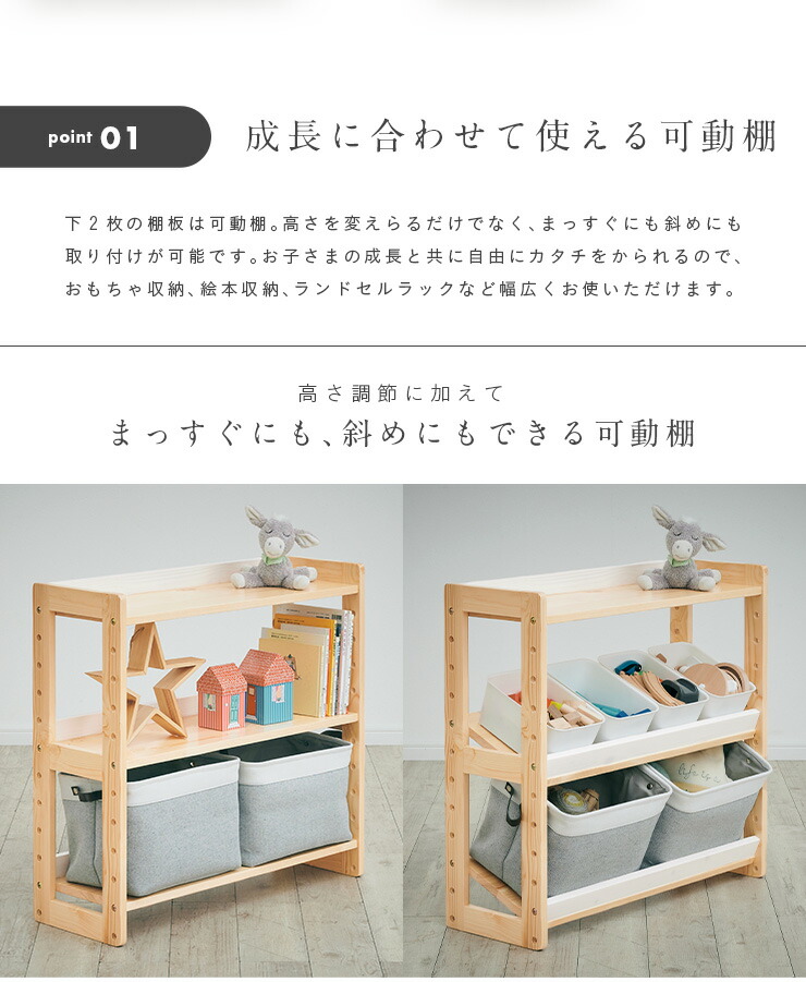 下2枚の棚板は可動棚。高さを変えらるだけでなく、まっすぐにも斜めにも取り付けが可能です。お子さまの成長と共に自由にカタチをかられるので、おもちゃ収納、絵本収納、ランドセルラックなど幅広くお使いただけます。