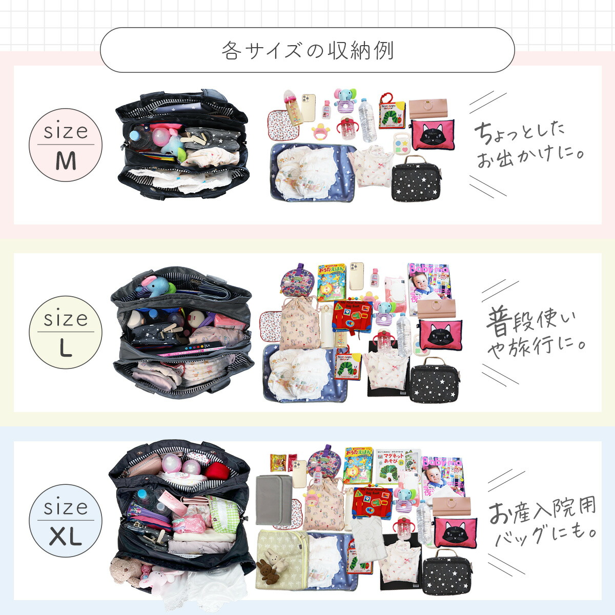 サイズは3サイズ展開で、Mサイズはちょっとしたお出かけにおすすめ、Lサイズは荷物が多めの方におすすめです。