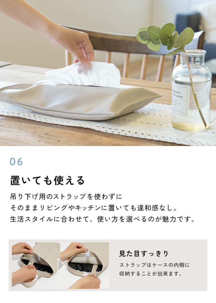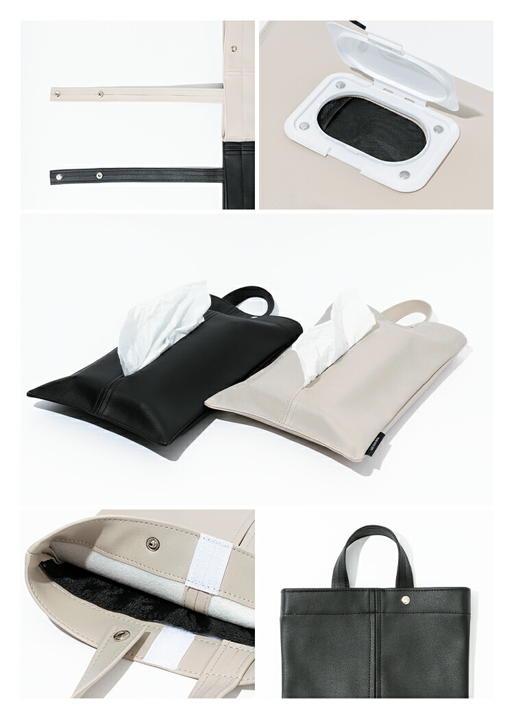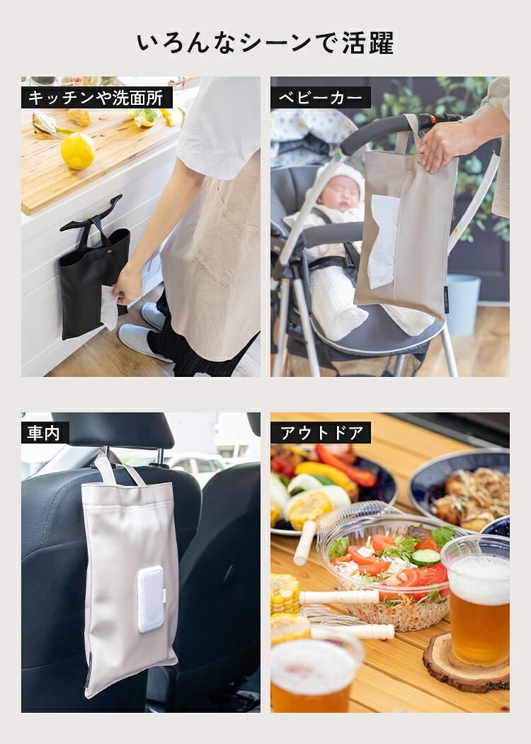 スナップボタン付きのベルトで、車のヘッドレストやフックなどにも簡単に取り付けられます。日常からお出かけまでマルチに活躍する2wayティッシュケースです。