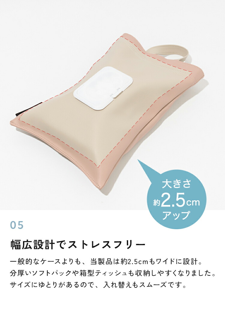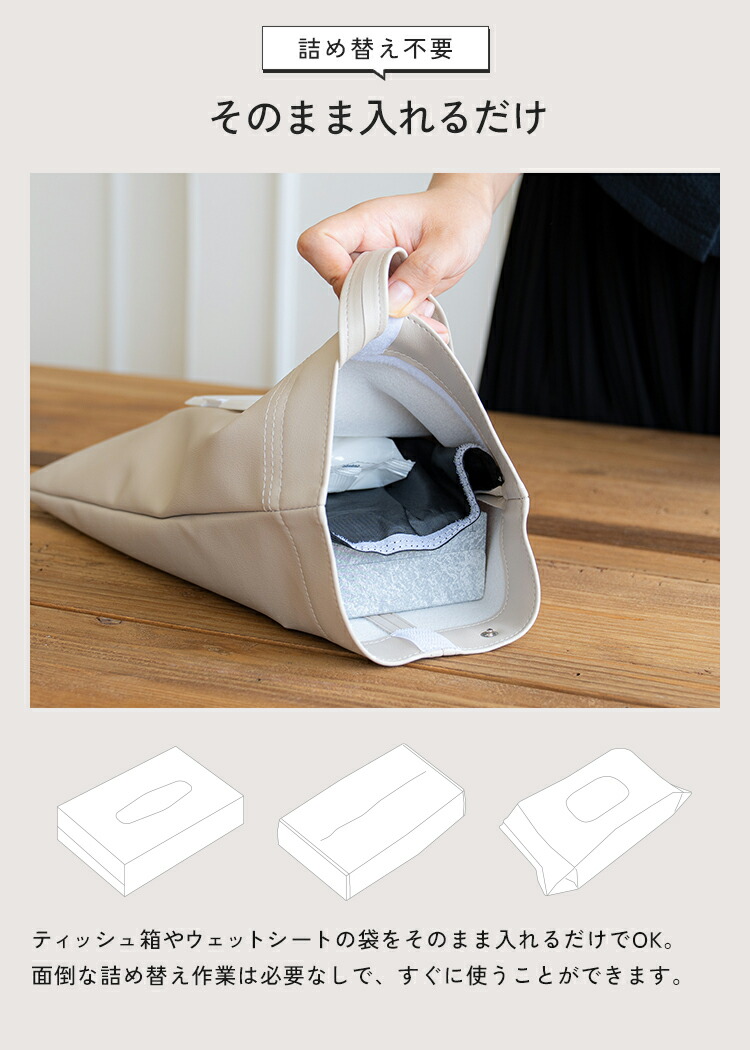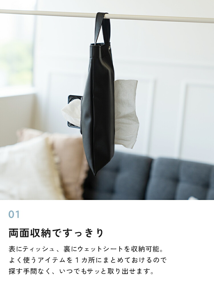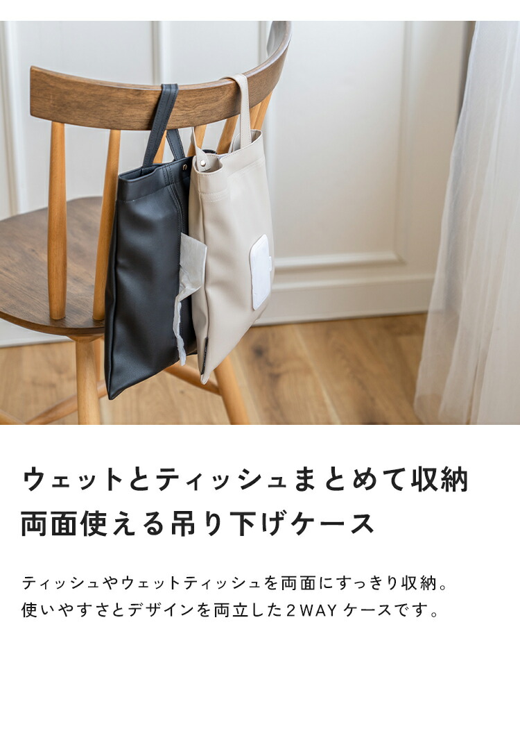 高見えするレザー調素材で、生活感を抑えながらすっきり収納。片面にティッシュ、反対にウェットシートをセット可能。