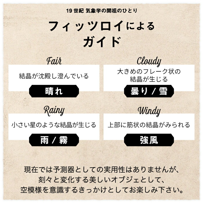 樟脳(クスノキのエキス)やエタノール等をガラス管に密封して作られており、気候の変化に反応して起きる結晶を観察する事で、役立てられていました。