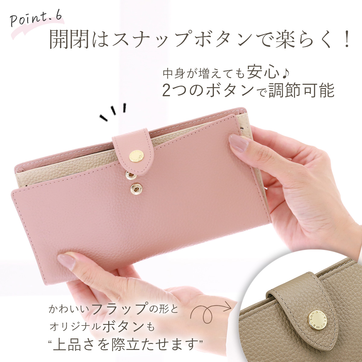 今流行の小さなハンドバッグやミニトートバッグ等にもかさばらずすっぽり納まり、シルエットが崩れにくい!また、中身の落下を防ぐおしゃれなフラップボタンを採用いたしました。