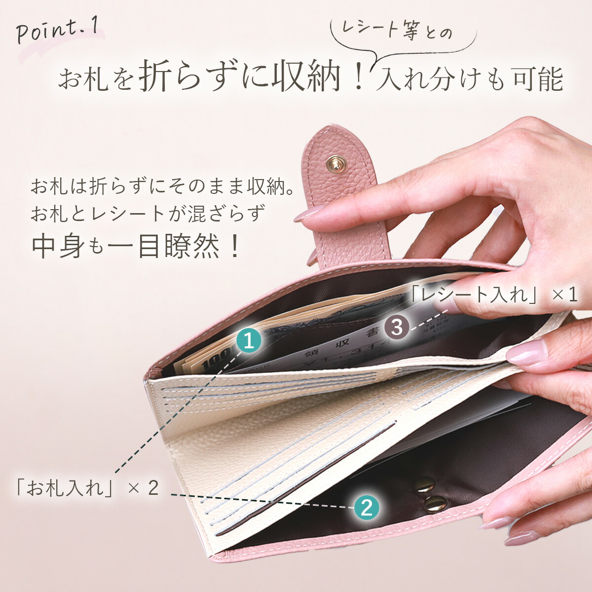 16か所のカードスペースとレシートポケットを備えており、極薄ながら大容量・使いやすさにもこだわりました!