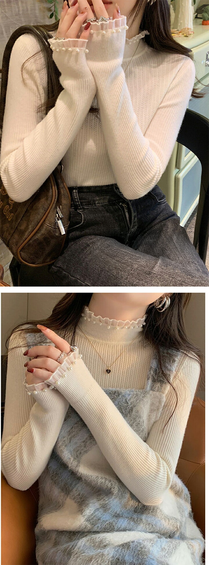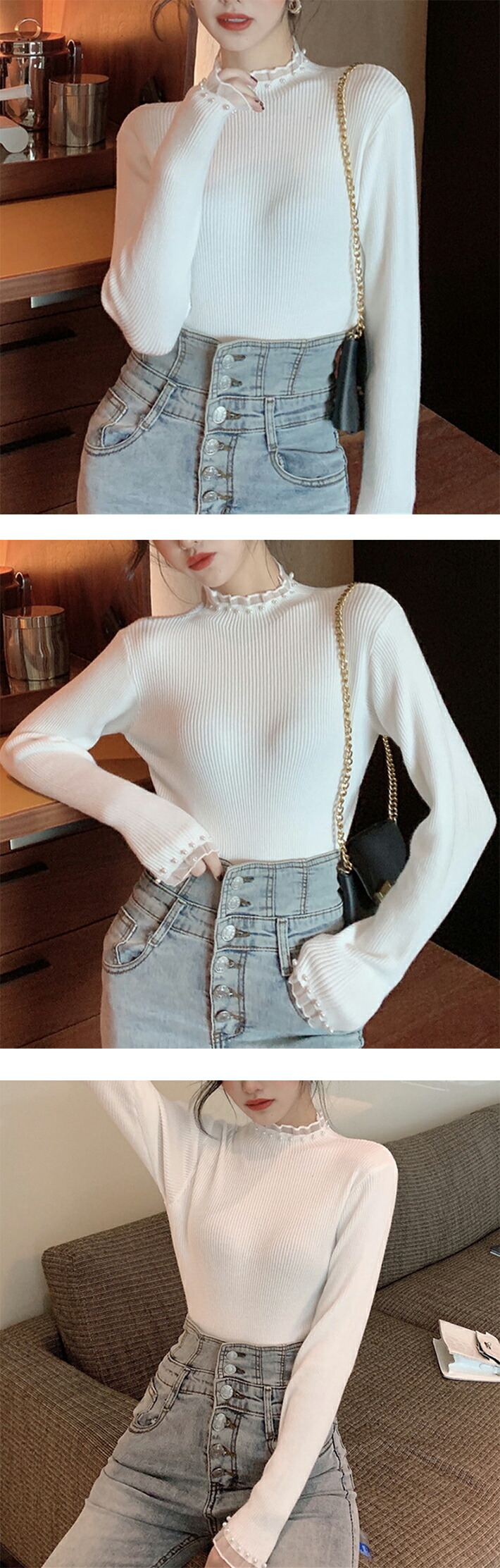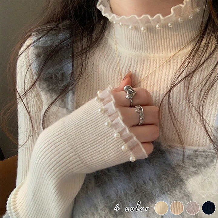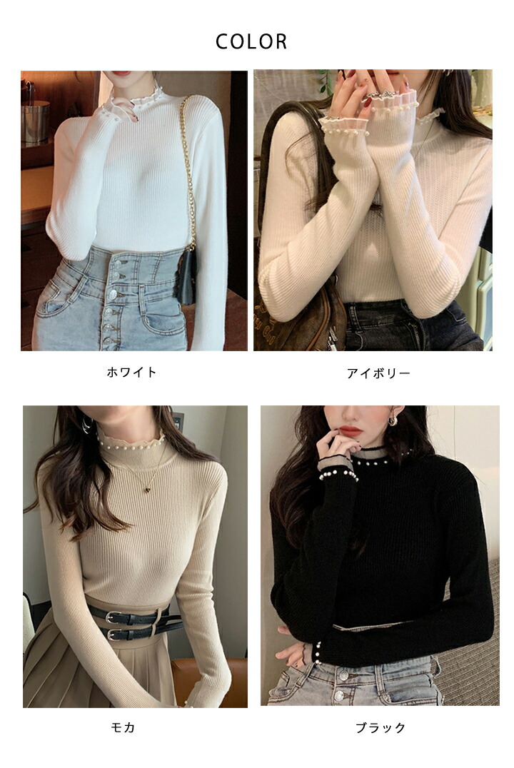 パール付きフリルハイネック 2B5 ニ レディースファッション 早い者勝ち アイボリー ホワイト モカ ブラック